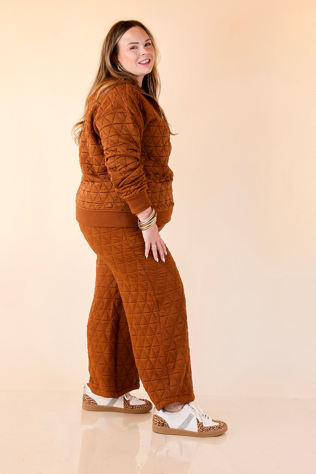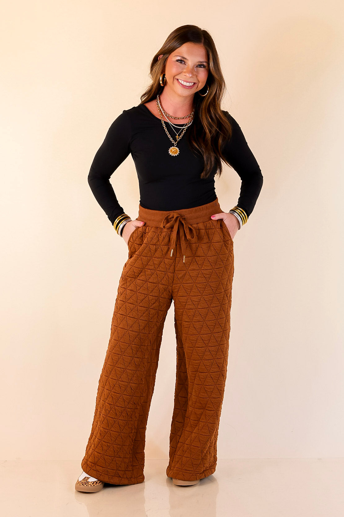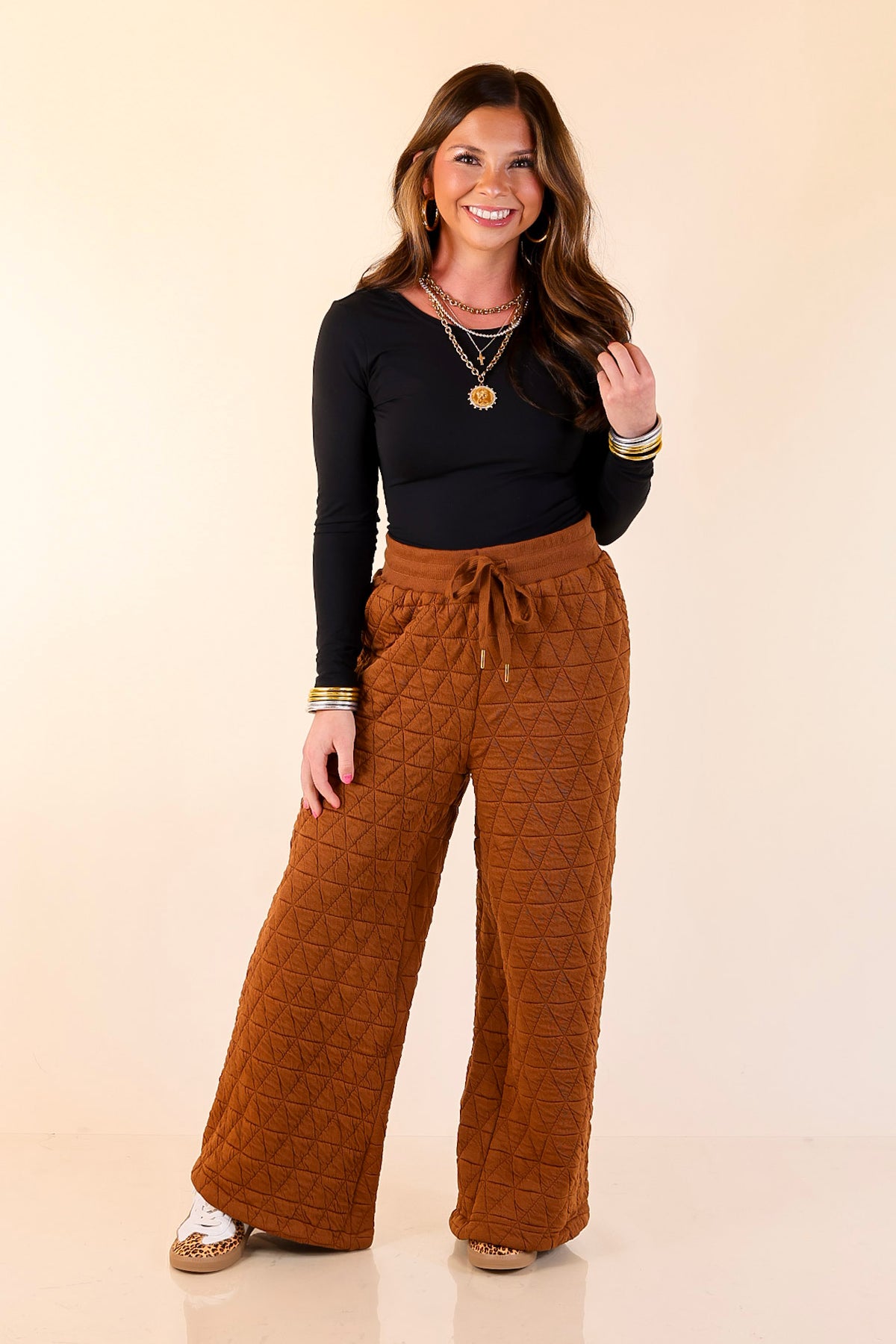 Everyday Elevated Quilted Wide Leg Drawstring Pants with Elastic Waistband in Rust Brown