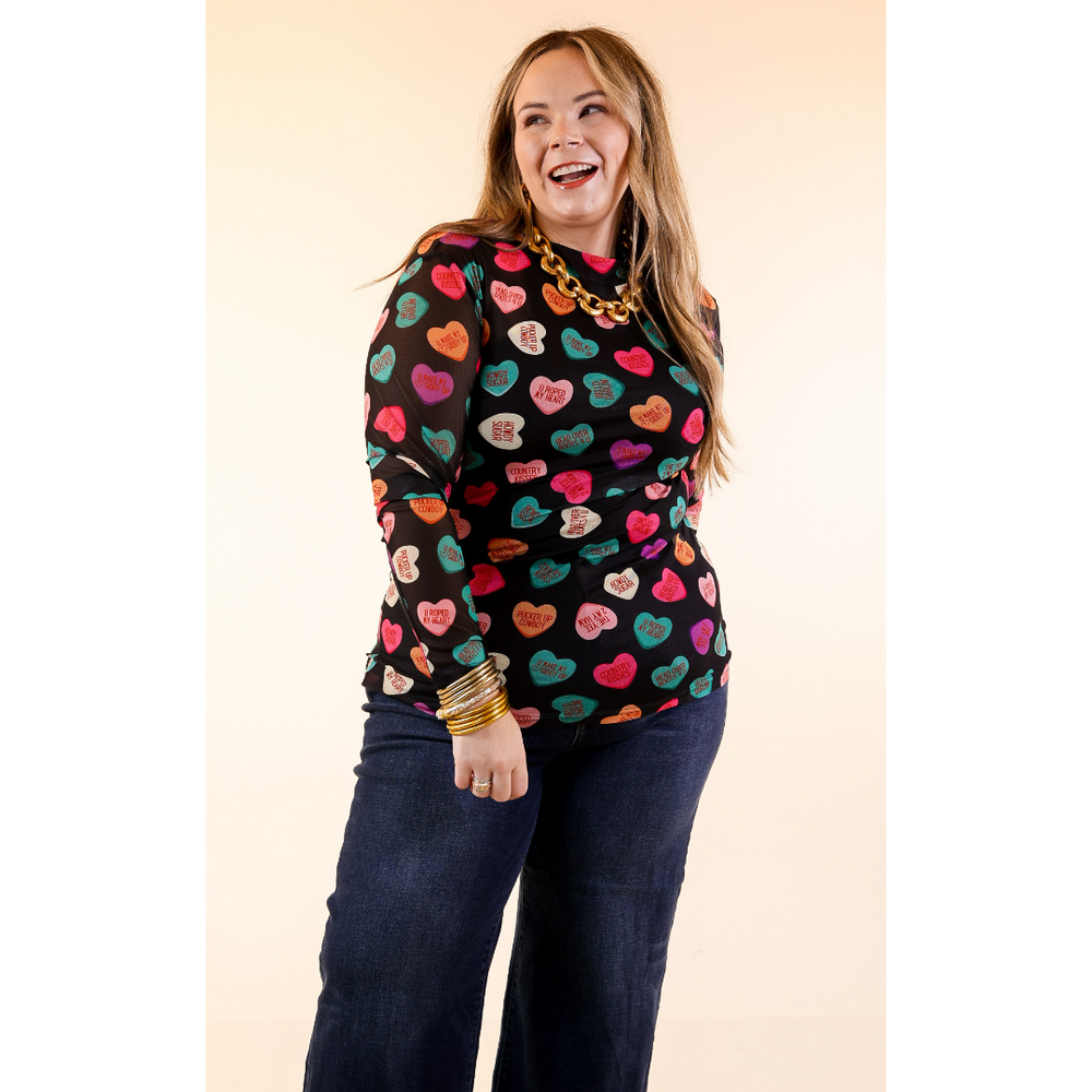 Sheer Confidence Western Theme Conversation Heart Print Mesh Long Sleeve Top in Black