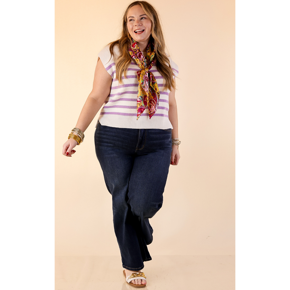 Stripe Things Up Drop Shoulder Knit Sweater in White with Lavender Purple Stripes