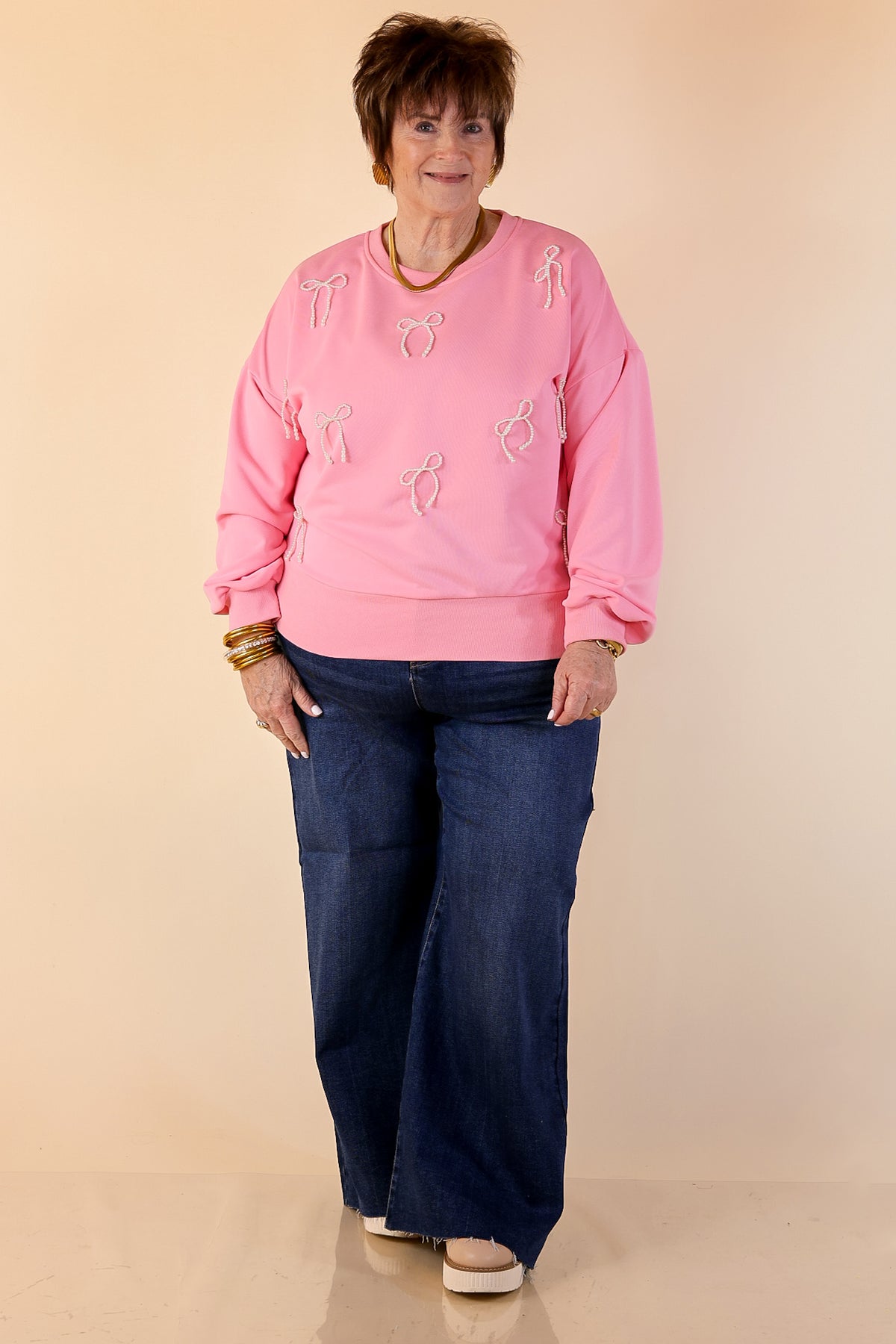 All Tied Up Pearl Bow Detail Long Sleeve Top with Scattered Bow Accents in Pink