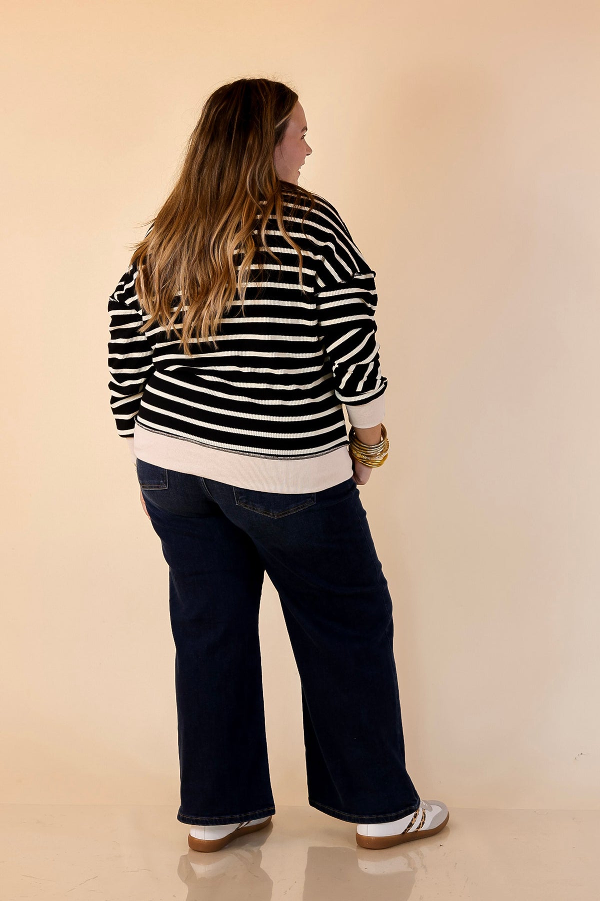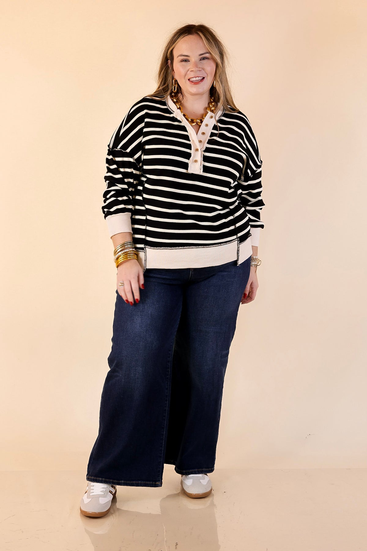 Casual Edge Long Sleeve Striped Henley Knit Top with Dropped Shoulders in Black with Ivory Stripes