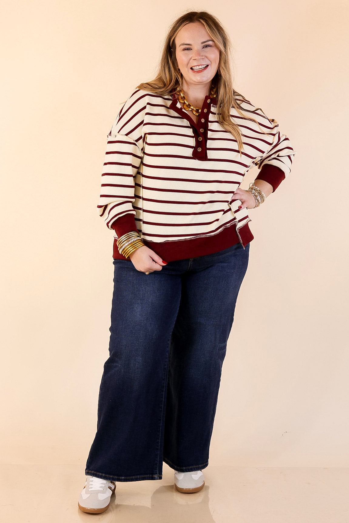 The Casual Edge Striped Long Sleeve Knit Top in ivory with maroon stripes is the perfect mix of classic and comfortable. Featuring horizontal stripes, a button Henley neckline, and relaxed drop shoulders, this knit top delivers an easy fit with elevated detail. The contrast trim adds a finished look that works for everyday wear while still feeling polished. Easy to style with denim or layered under jackets and vests, this top transitions effortlessly as seasons change.