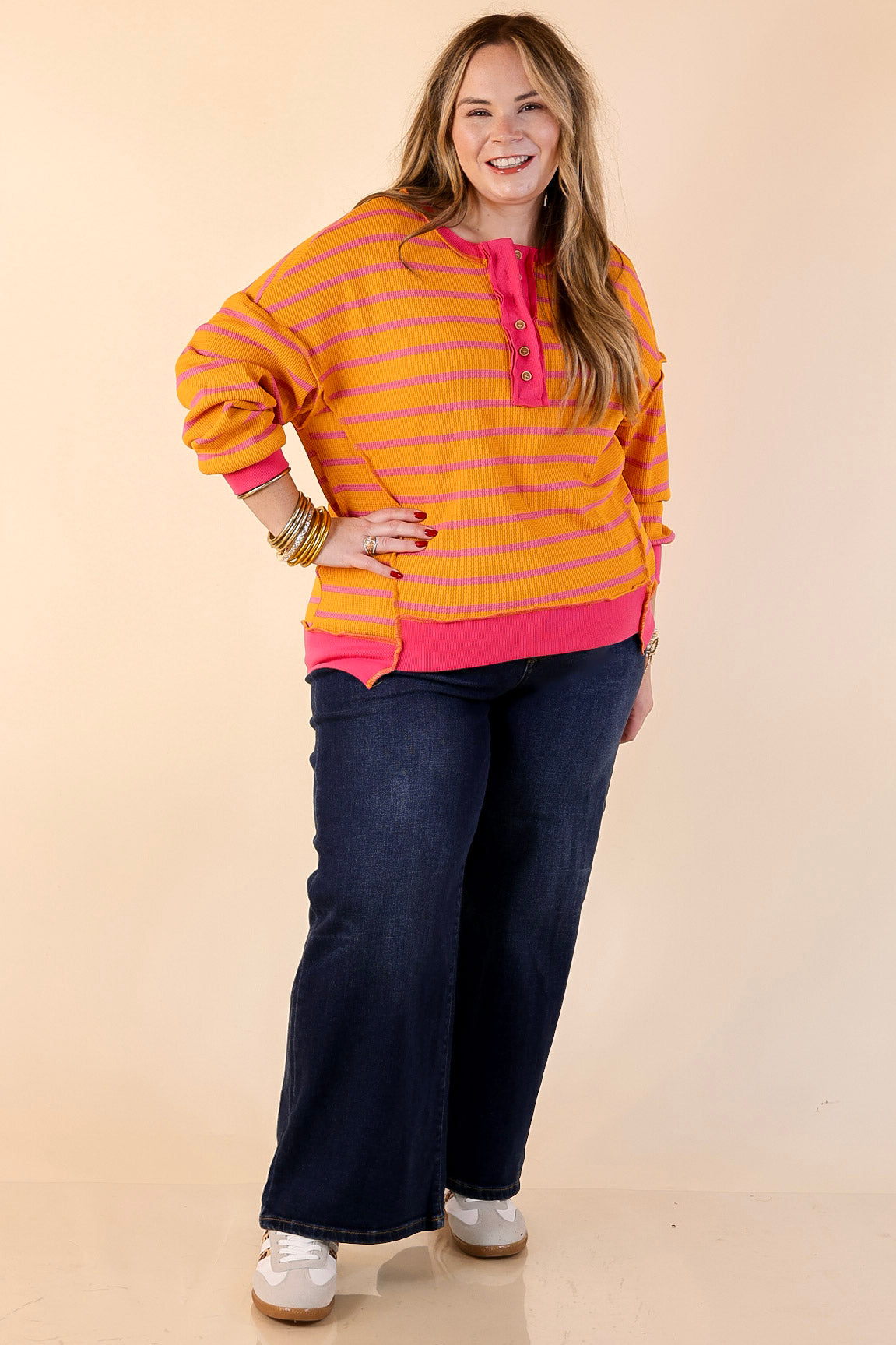 The Casual Edge Striped Long Sleeve Knit Top in orange with pink stripes brings a bold color combination to an easy, everyday silhouette. Featuring horizontal stripes, a button Henley neckline, and relaxed drop shoulders, this knit top is designed for comfort without sacrificing style. The contrast trim adds a polished touch, making it an effortless option for casual days or layered looks as the seasons change.