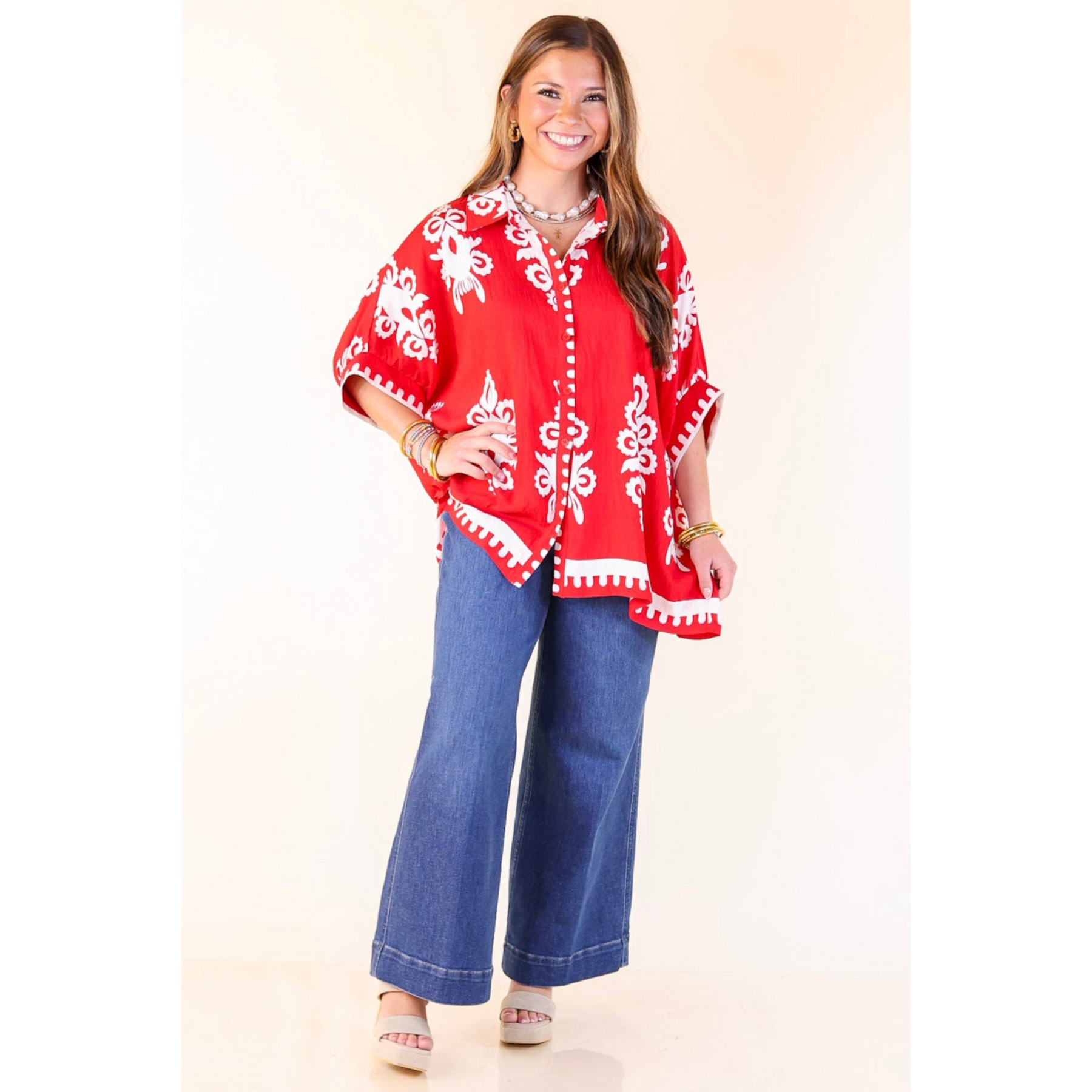 Classic Perfection Damask Print Button Up Collared Blouse in Red