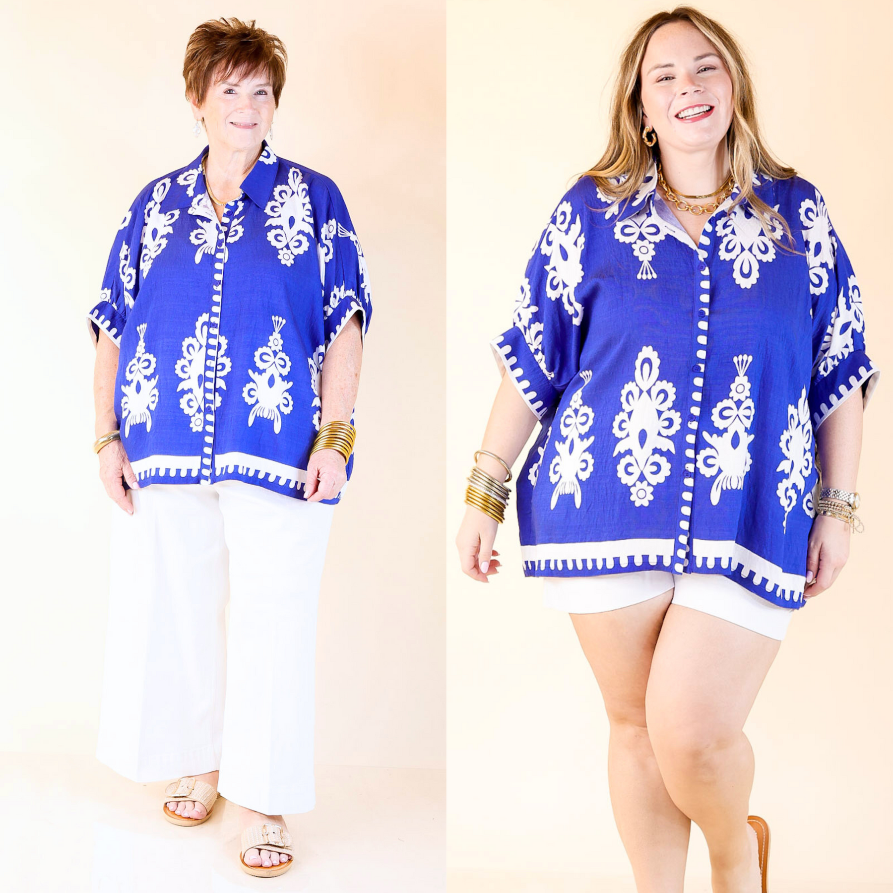 Classic Perfection Damask Print Button Up Collared Blouse in Royal Blue