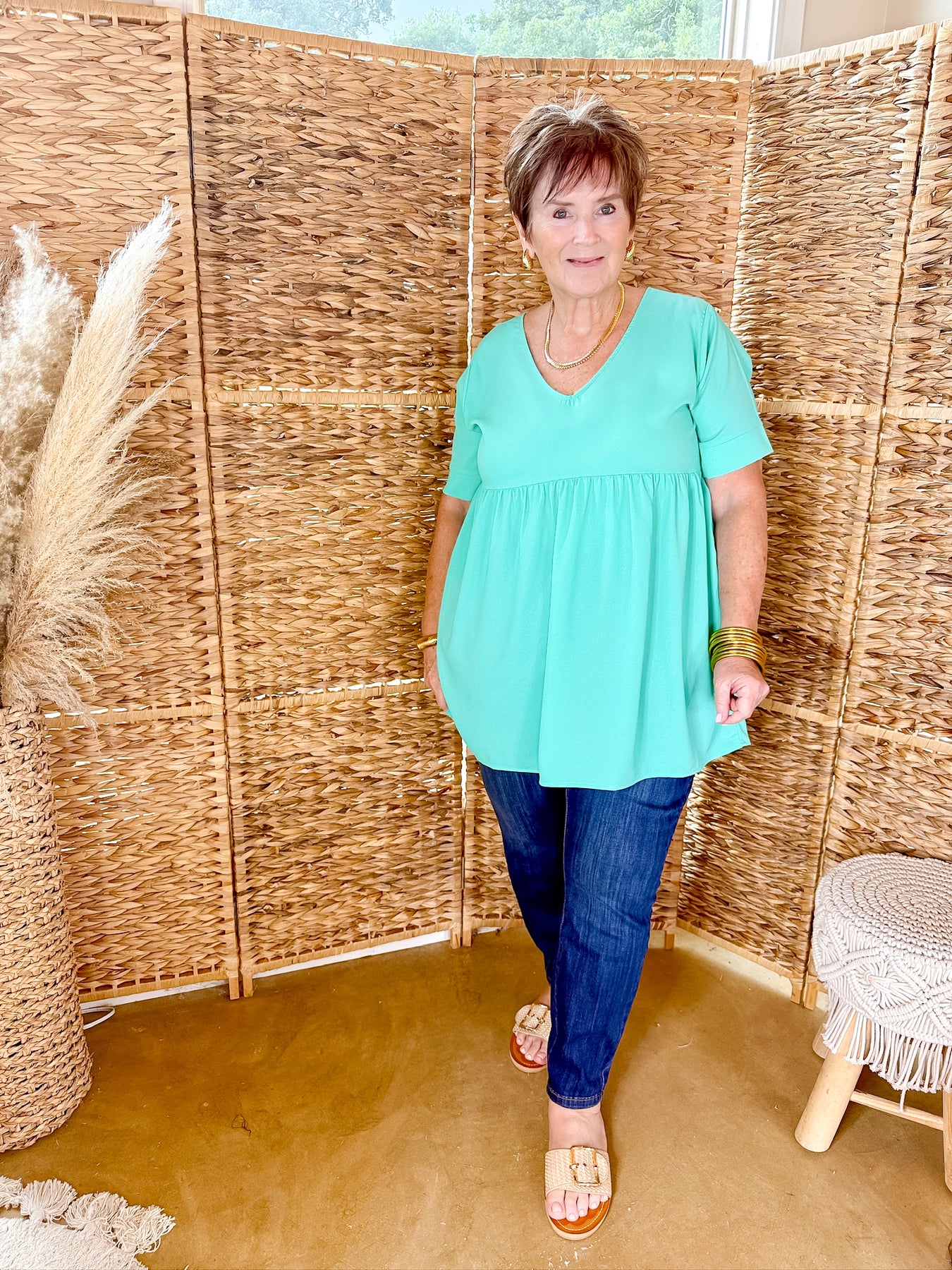 Daily Delight Short Sleeve V Neck Babydoll Top in Mint Blue