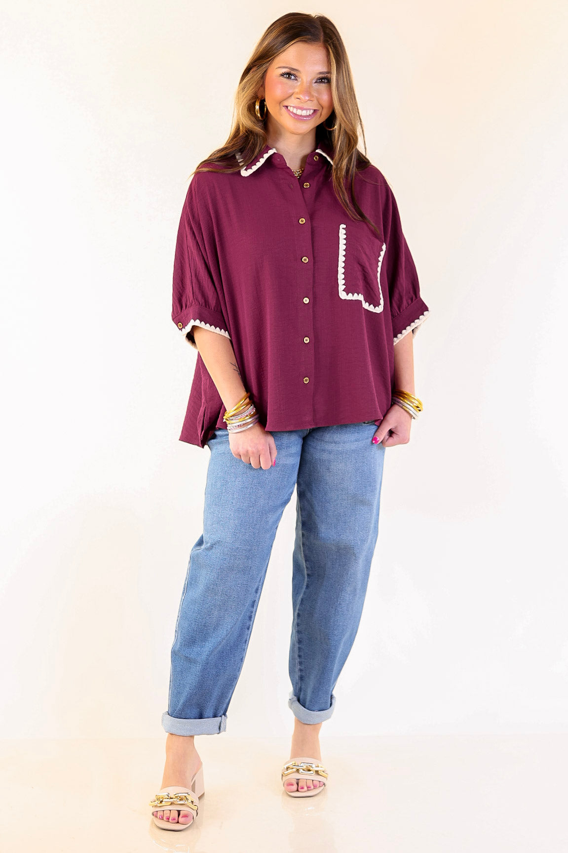 In Good Company Button Up Top with Scalloped Trim Stitching in Maroon