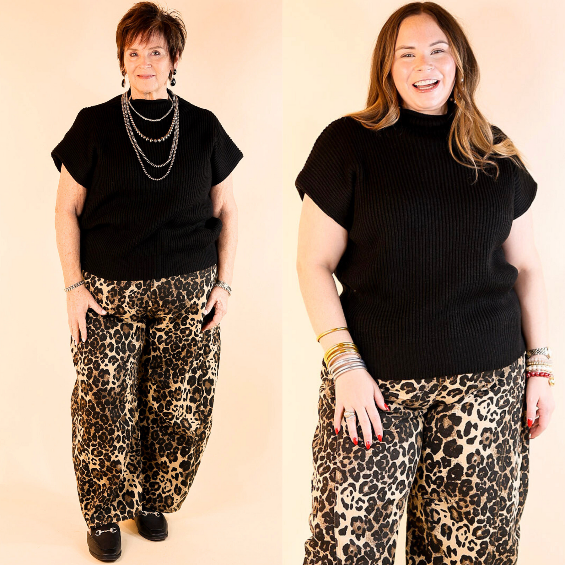 Model: Abby is wearing a size medium. Nancy is wearing a size large.