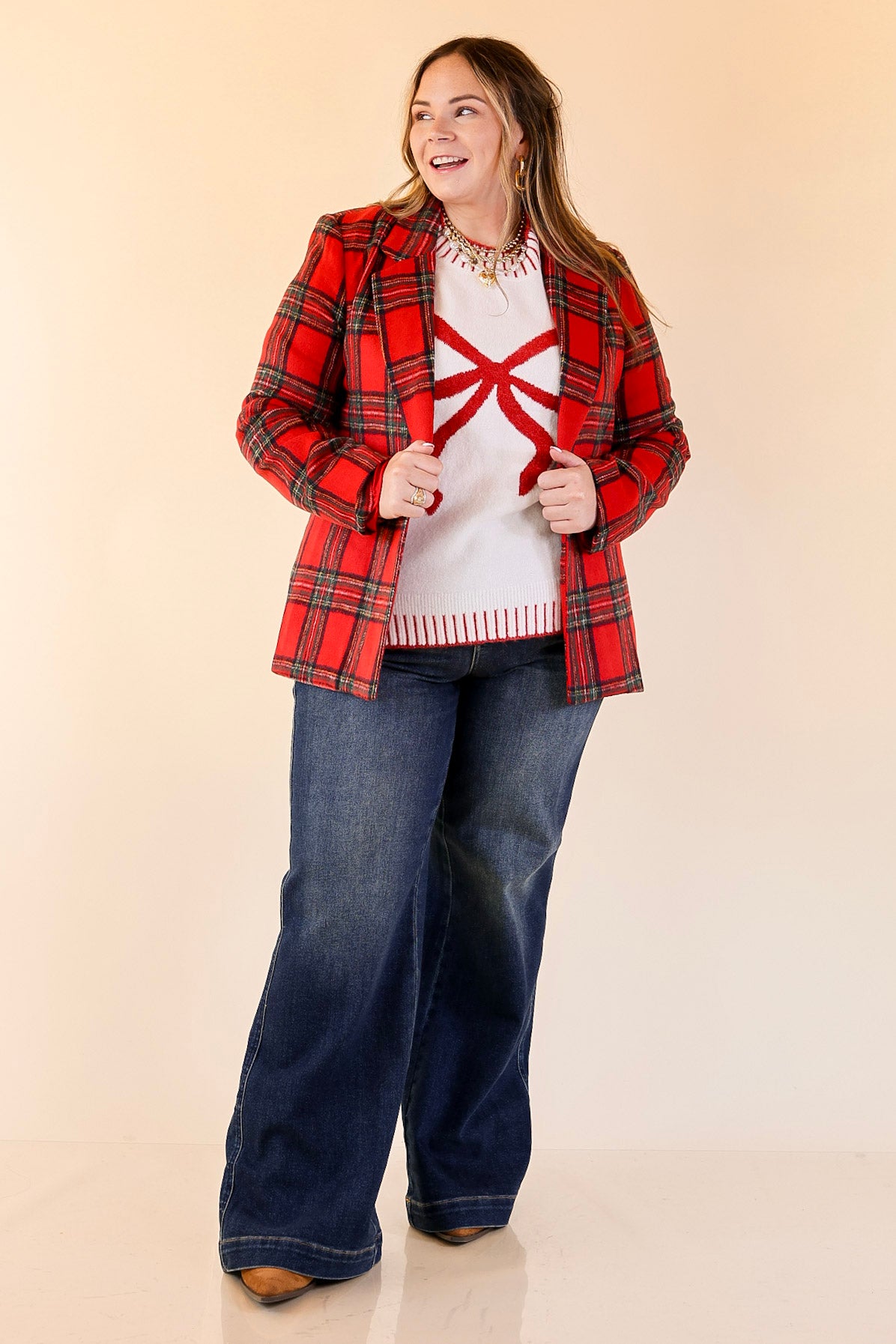 Sweet and statement-making, the Wilder Sweater by Mud Pie is the holiday-ready knit your closet has been waiting for. This cozy white sweater features a bold red bow graphic on the front, trimmed with matching red stitching along the neckline, cuffs, and hem for that extra pop of festive charm.