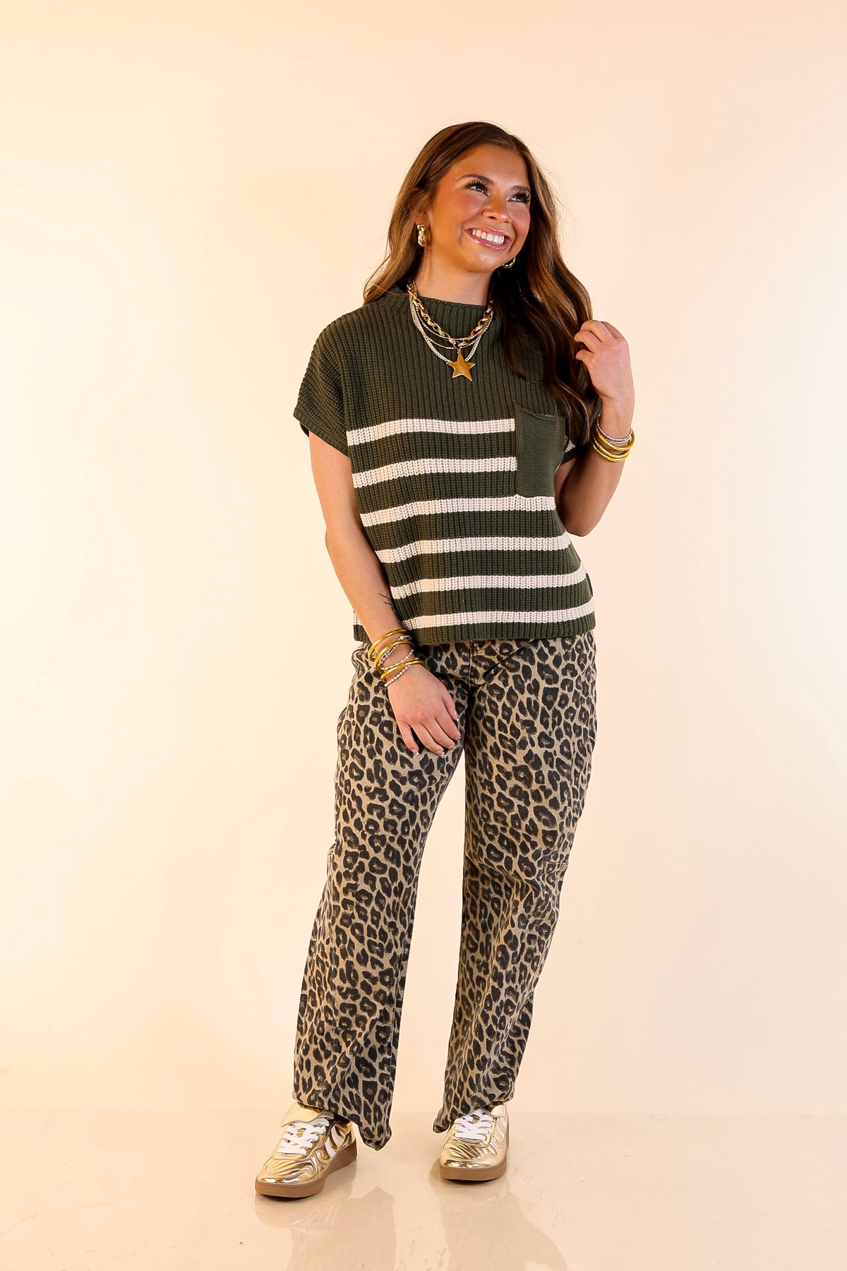 Repeat Worthy Striped Cap Sleeve Cropped Sweater with Front Pocket in Olive Green