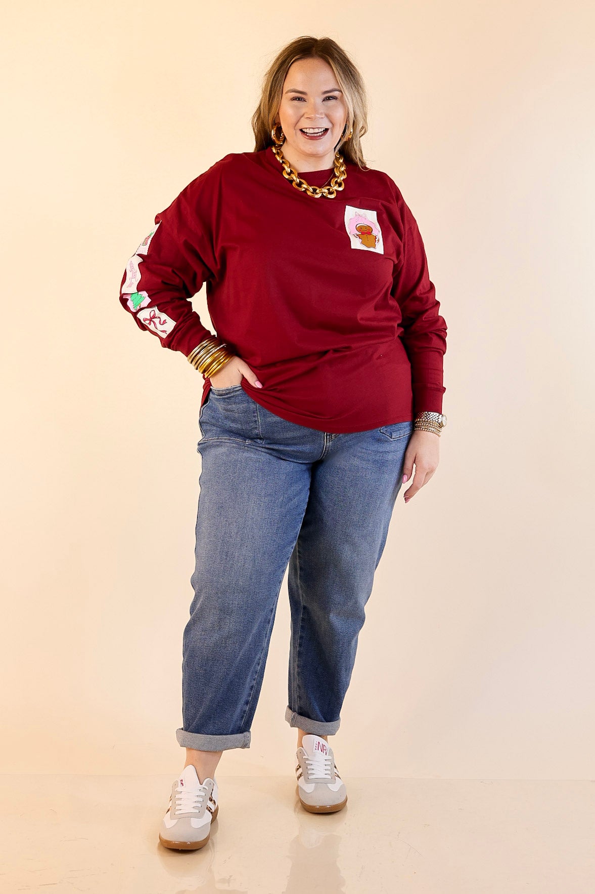 The Merry Mail Holiday Stamp Long Sleeve Graphic Tee in Carmine Red captures all the festive feels of the season. Featuring a cheerful grid of holiday icons—from Santa and gingerbread men to ornaments and bows—this Simply Southern tee delivers Christmas charm in every detail. Crafted from soft cotton fabric with a relaxed fit, it’s perfect for cozying up at home, wrapping gifts, or running holiday errands in comfort and style.