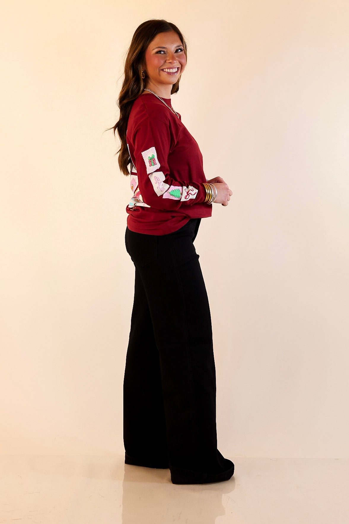 Simply Southern | Merry Mail Holiday Stamps Long Sleeve Graphic T-Shirt in Maroon