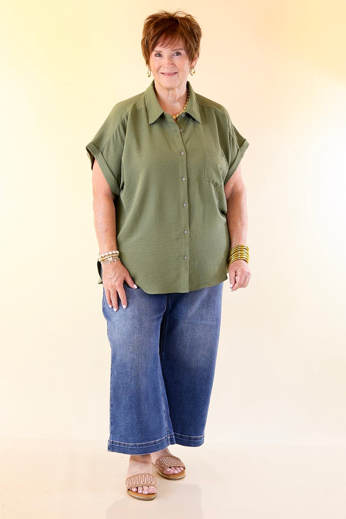 The drop shoulder sleeve gives it a relaxed, breezy vibe while the collared button-up front and chest pocket keep things polished. We love it worn loose with jeans, tied at the waist with shorts, or even layered open over a tank like a shacket.