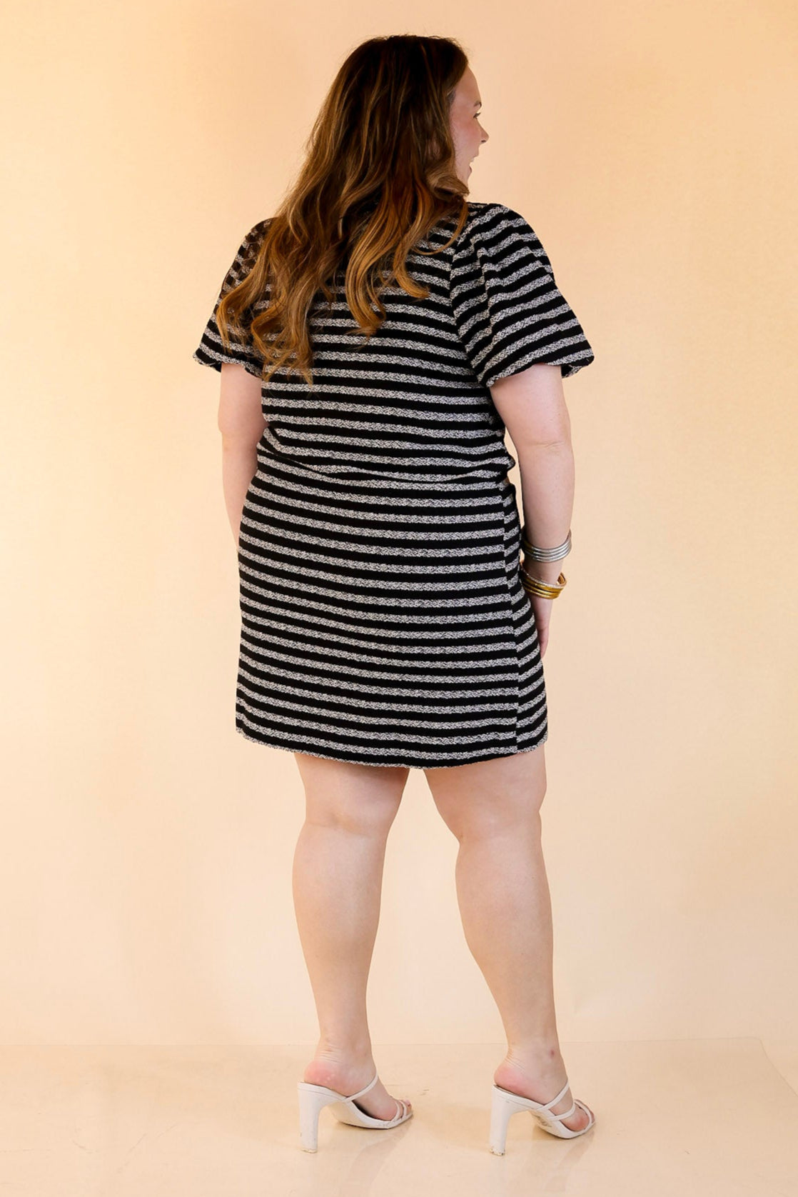 Stripes of Elegance A-Line Button-Up Dress With Puff Sleeves, and Bow Detail in Black
