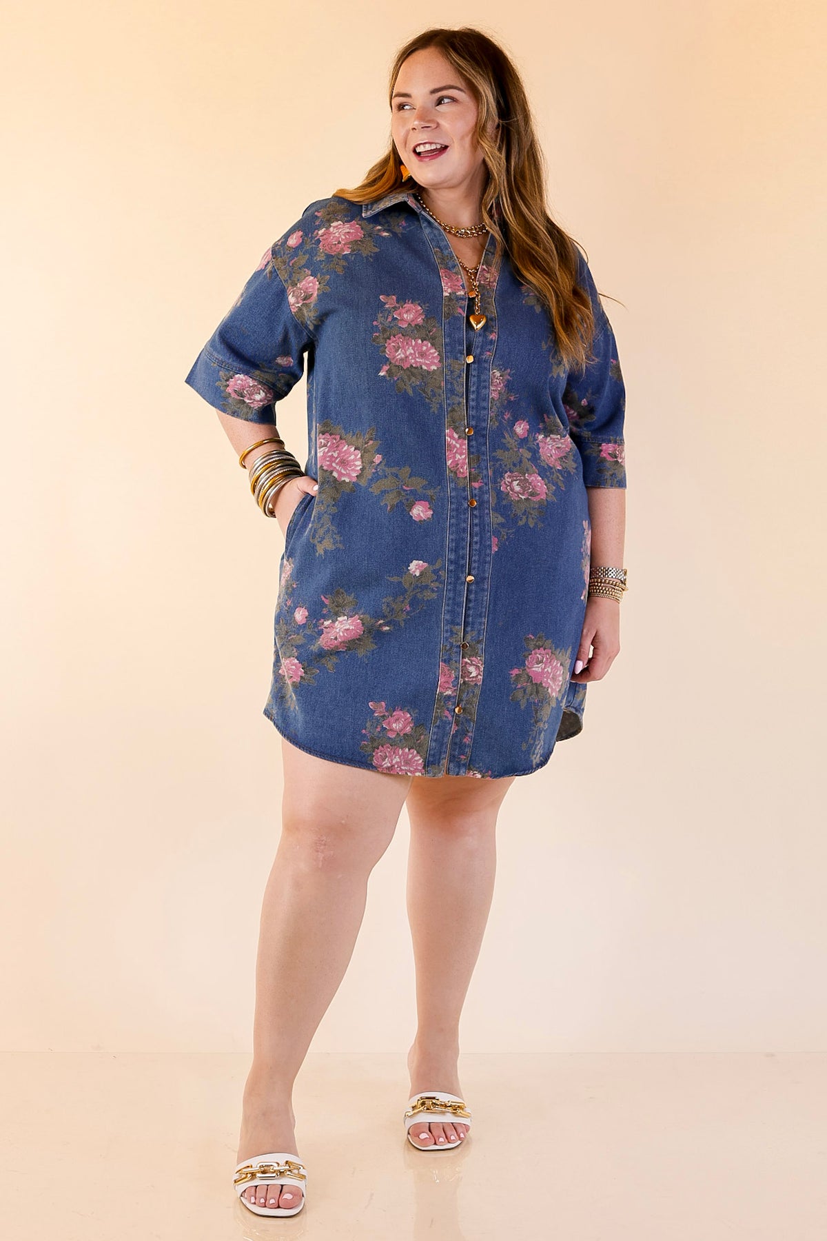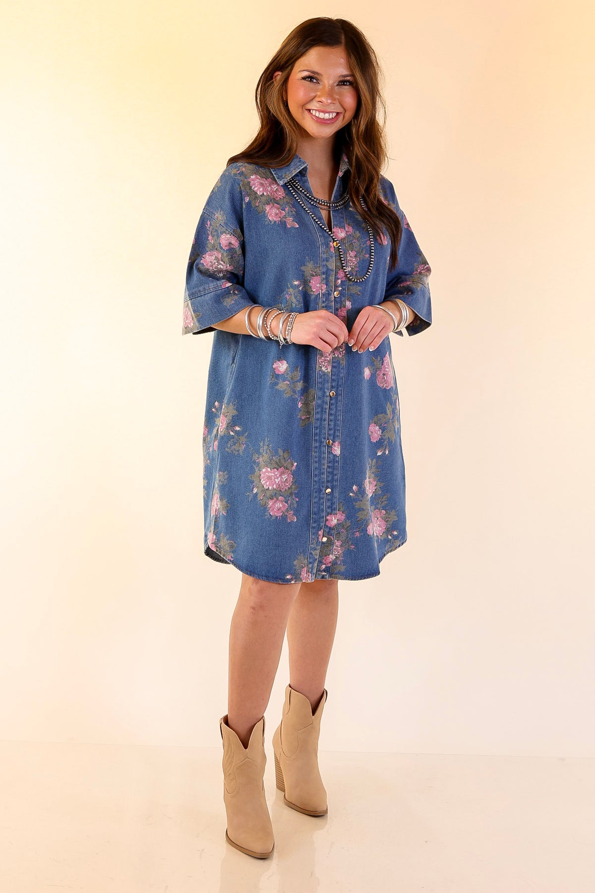 Playful yet polished, the Flirting with Florals Dress is where classic denim meets feminine charm. Designed in a soft, lightweight denim, this shirt dress features a button-front design, short drop-shoulder sleeves, and an all-over pink rose print for the perfect mix of casual and romantic.