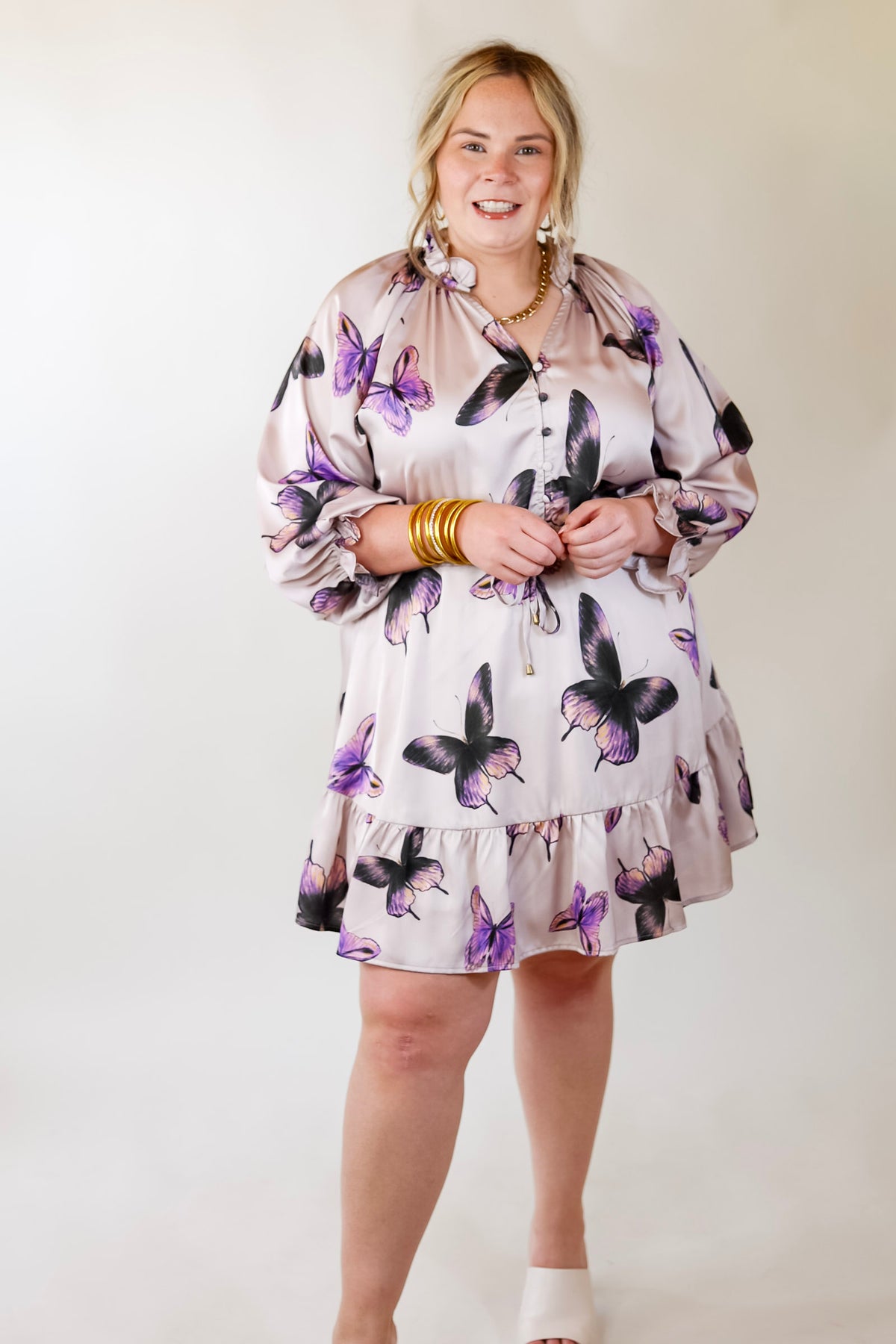 Say goodbye to boring style and let your inner butterfly take flight with this muted purple dress! This stunning piece features an array of butterflies in shades of purple and pink, a v-neck, ruffle neckline, tie waist, and cuffed sleeves - perfect for any warm day spent chasing your wildest dreams! Abby is wearing a size large.
