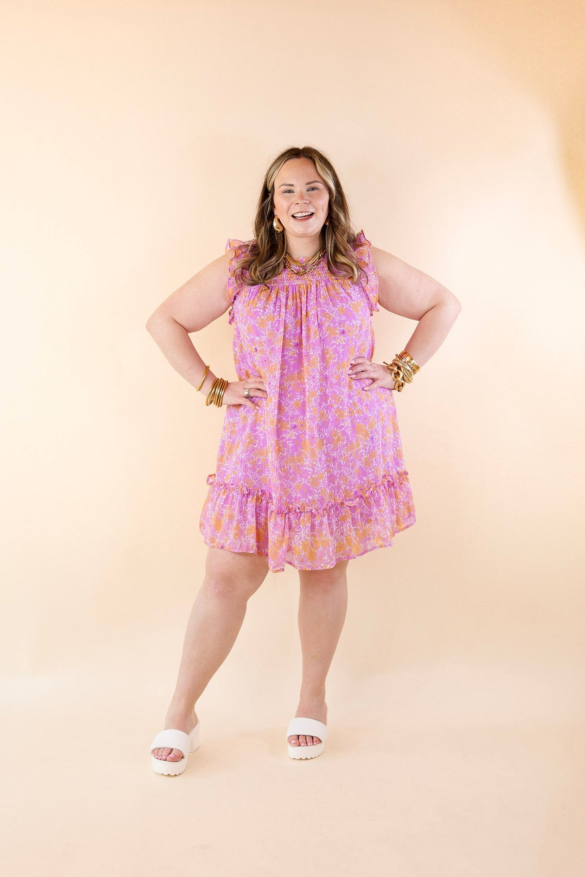 New To The Scene Floral Dress with Ruffle Cap Sleeves in Purple and Orange