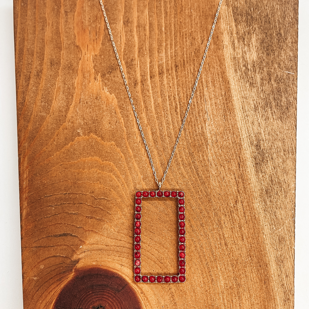 Long Gold Necklace with Open Rectangle Pendant in Burgundy