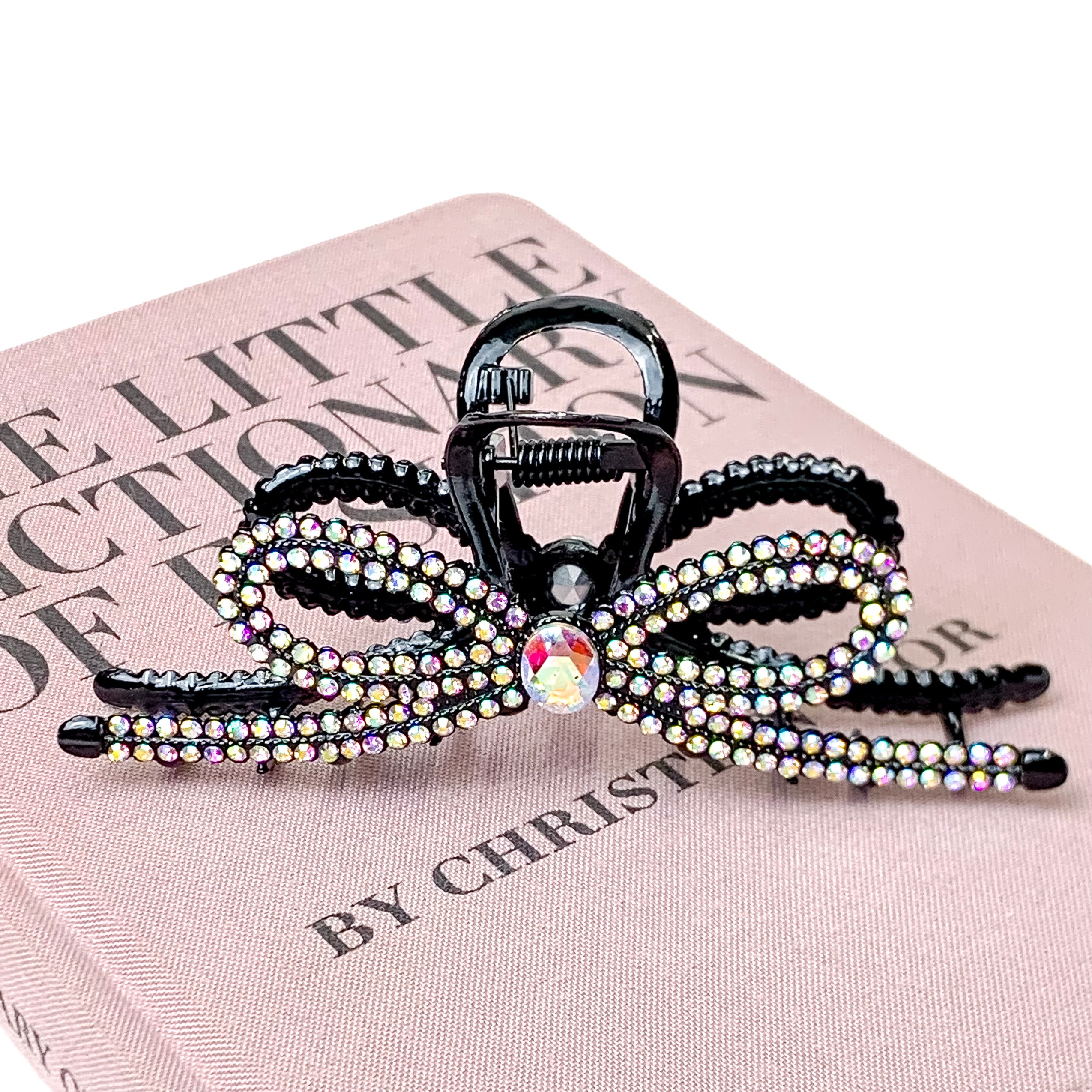 AB Crystal Embellished Ribbon Shaped Metal Hair Clip in Black