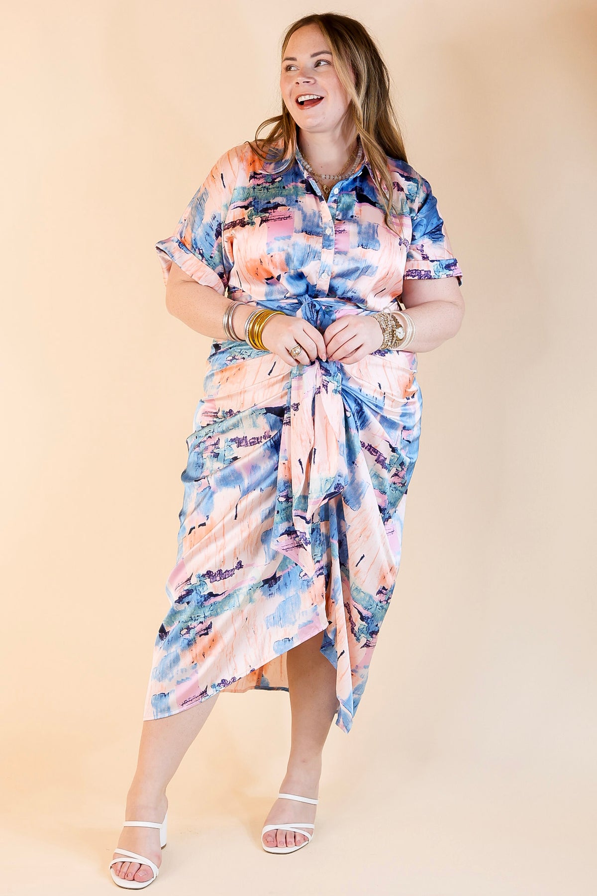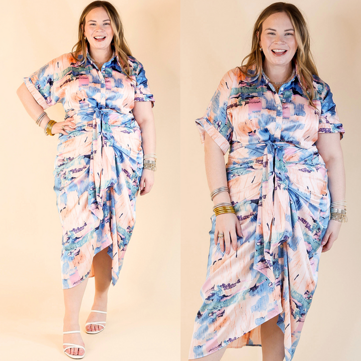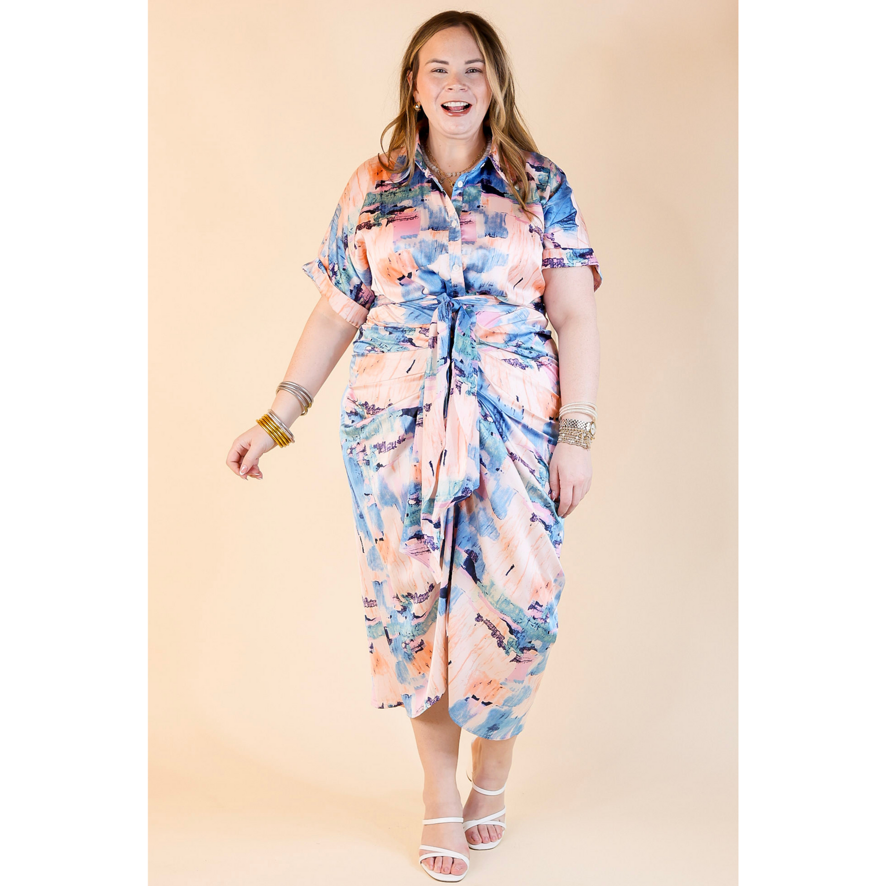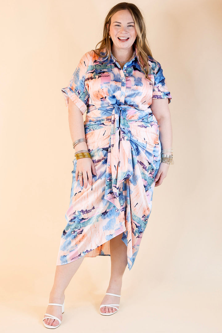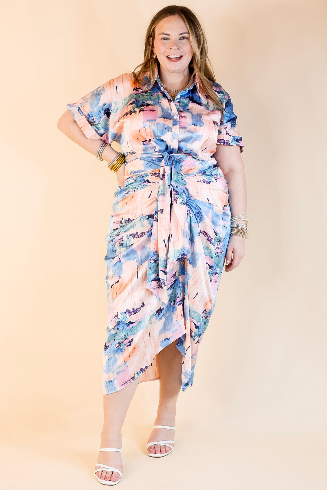 Abstract Meetings Collared Button Up Midi Dress With a Tied Waist in Blue and Coral Pink
