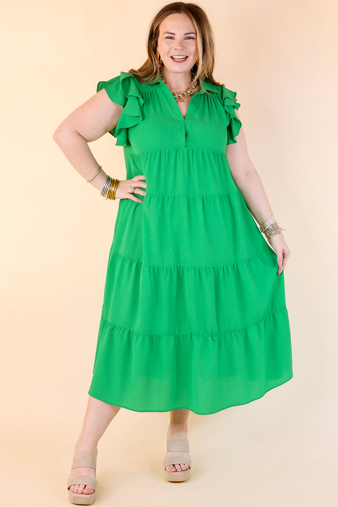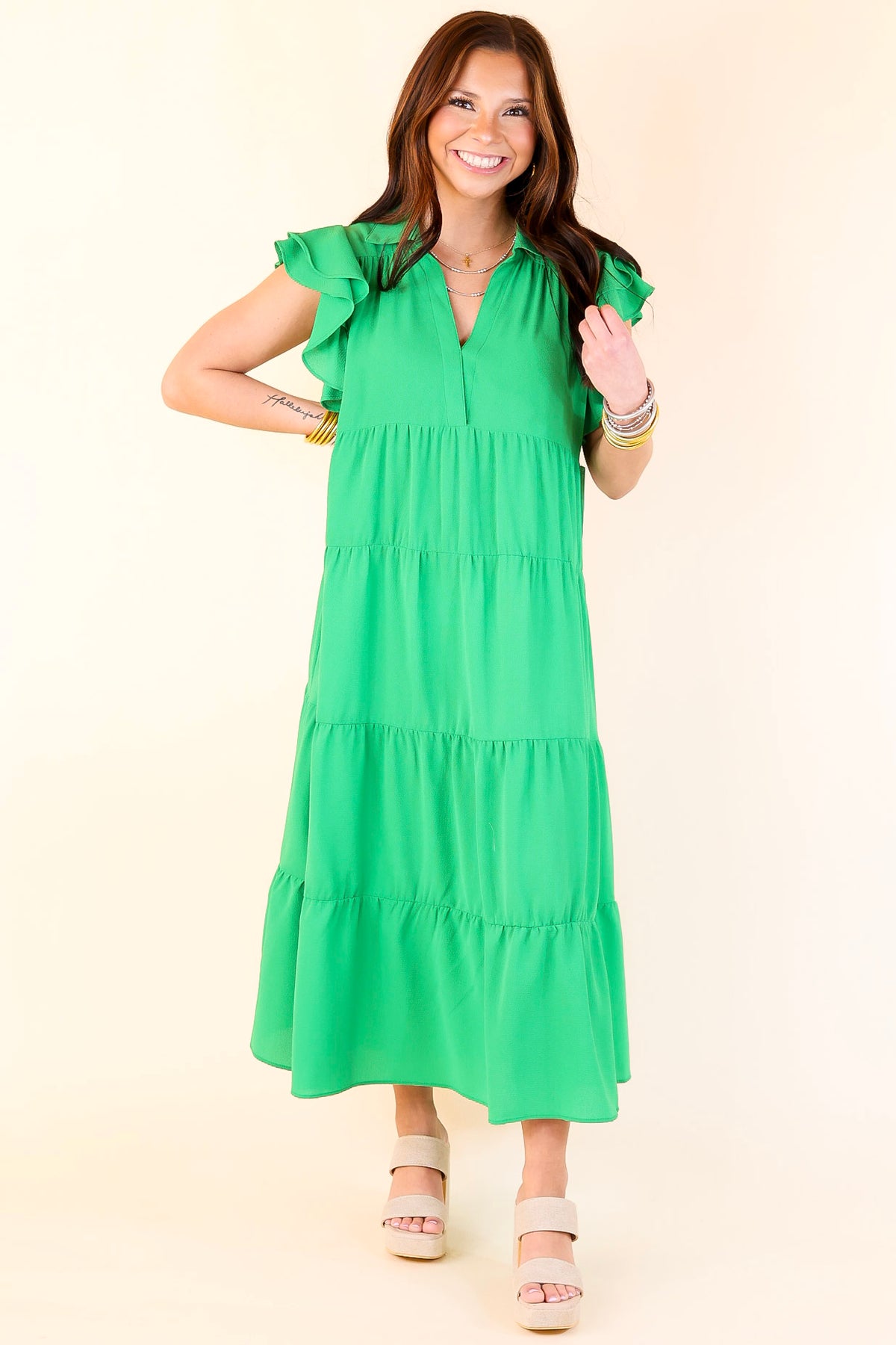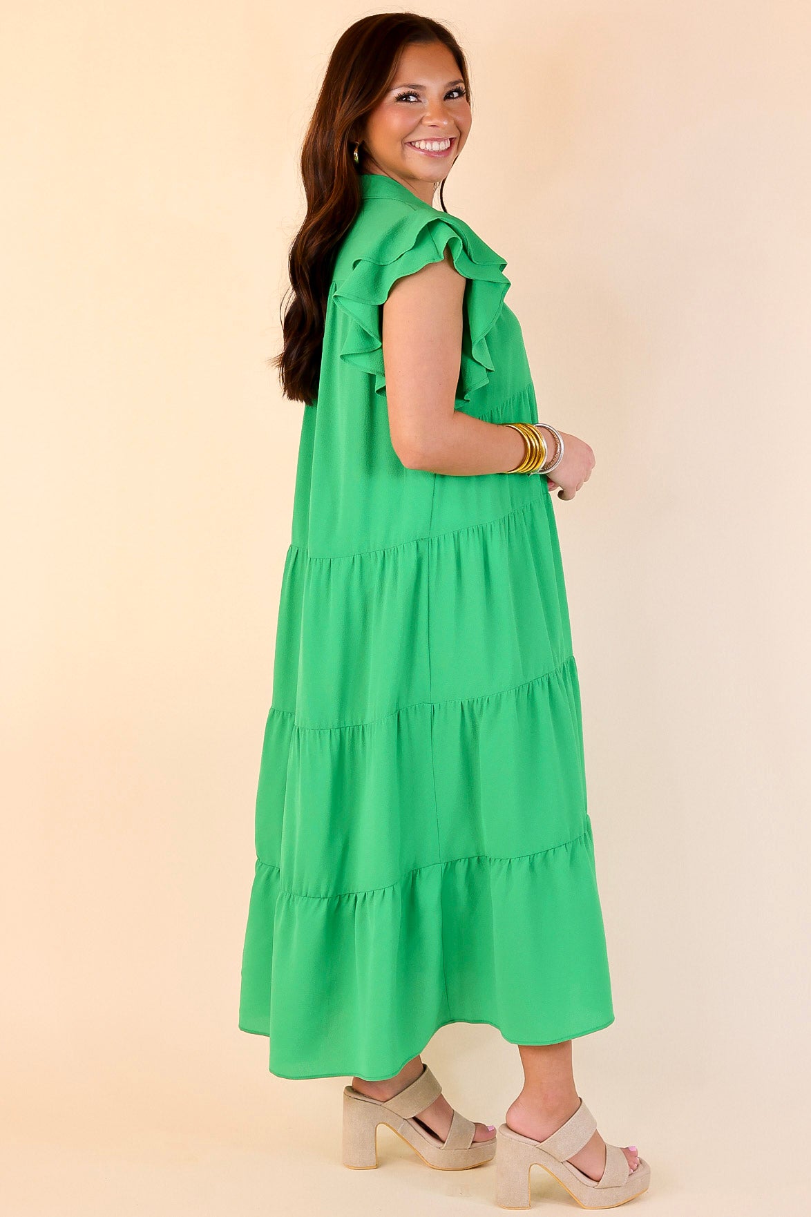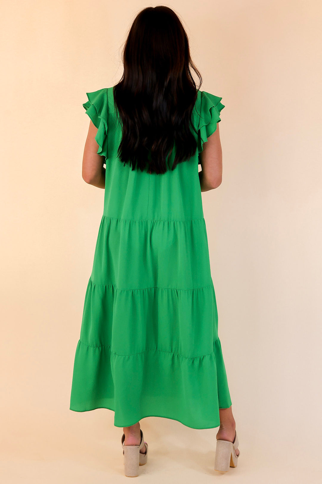 All Of A Sudden Tiered Midi Dress with Ruffle Cap Sleeves in Green