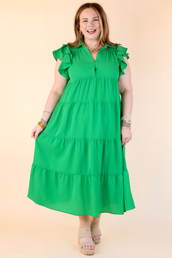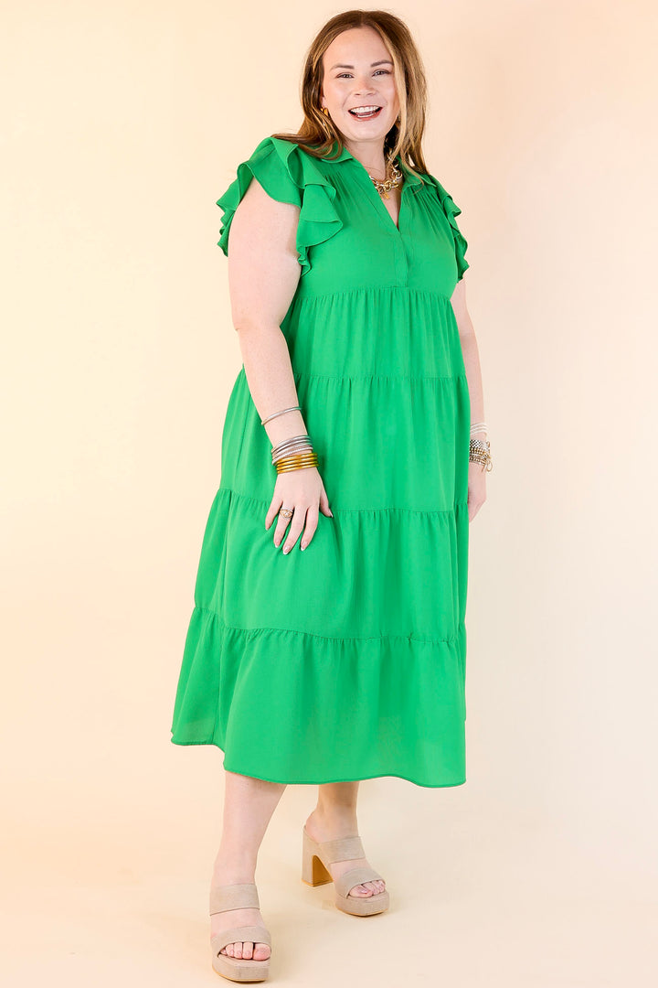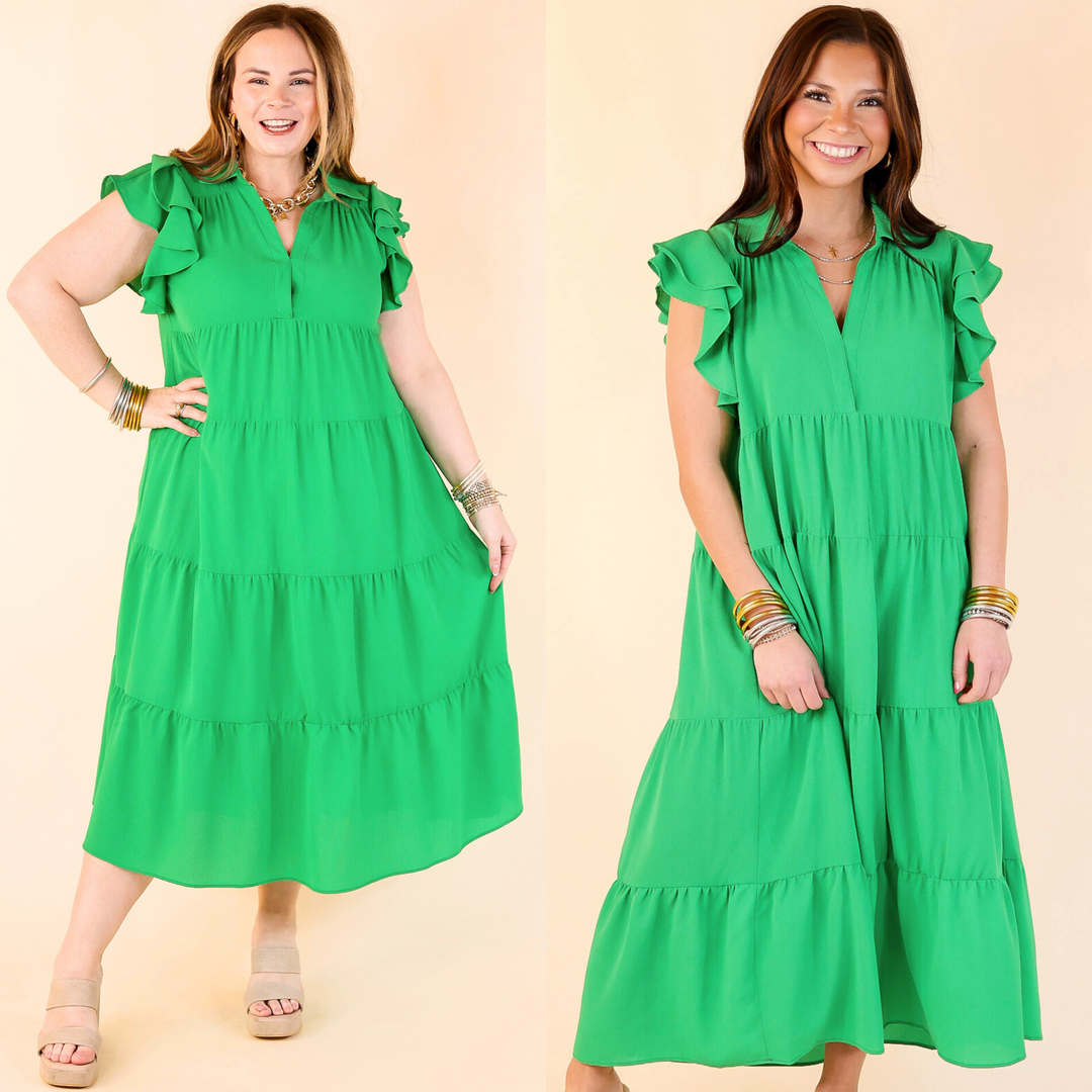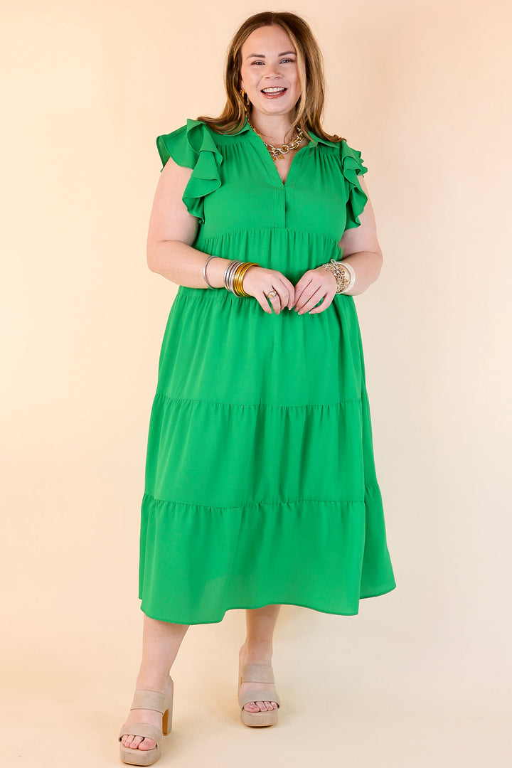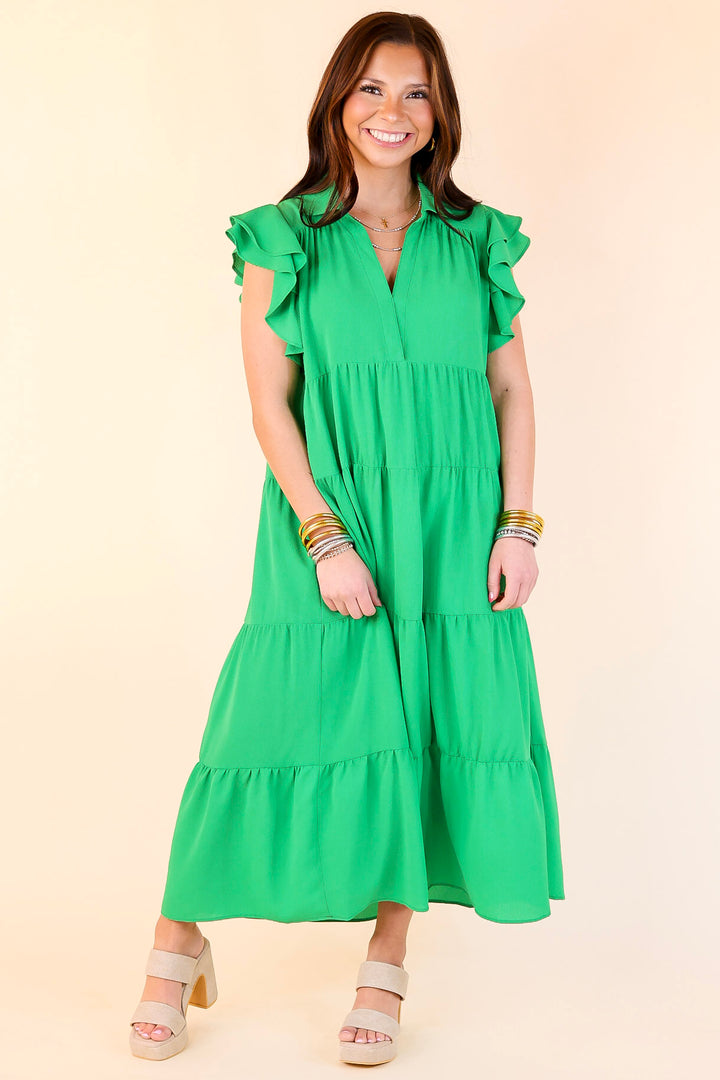 All Of A Sudden Tiered Midi Dress with Ruffle Cap Sleeves in Green