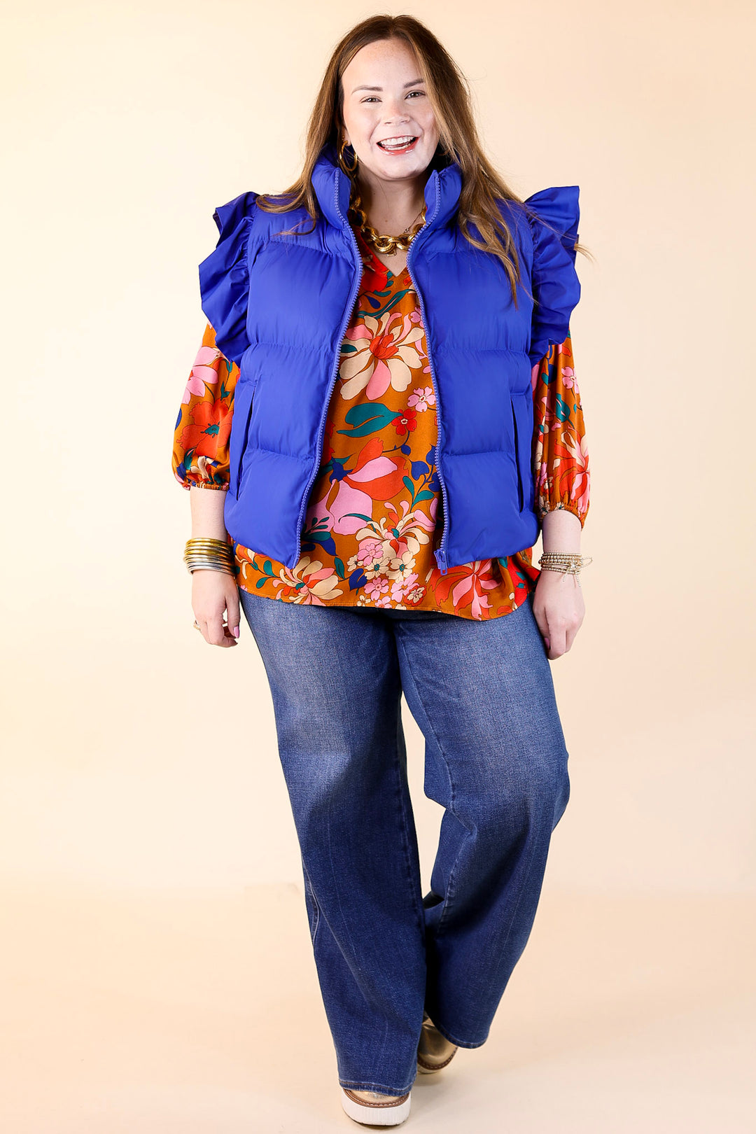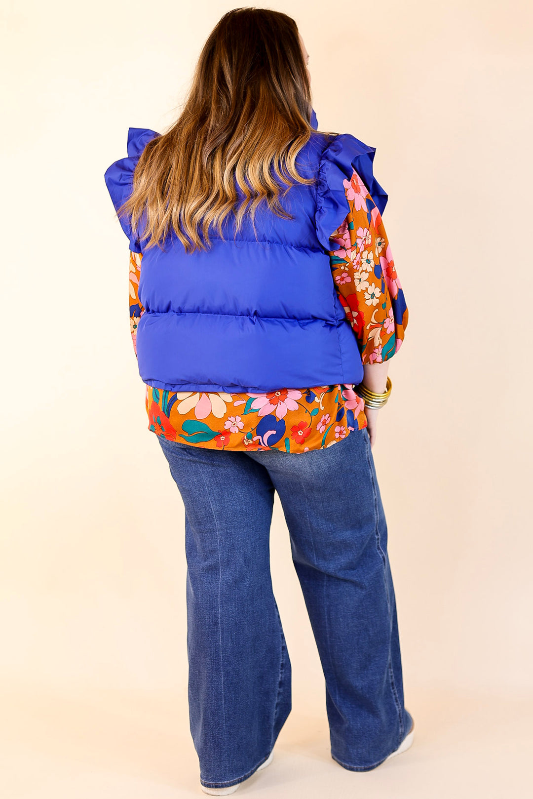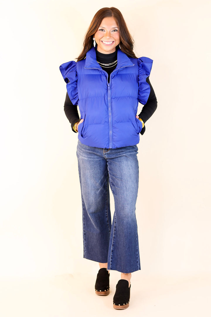All Season Long Ruffle Sleeve Puffer Vest in Royal Blue