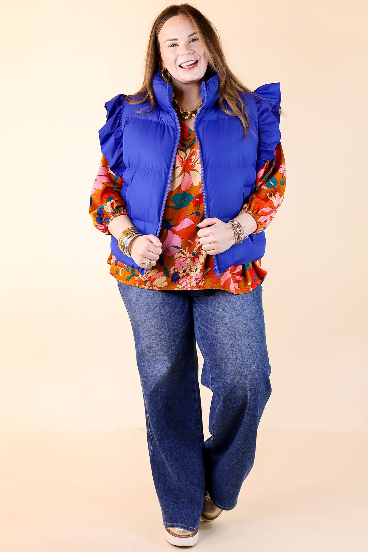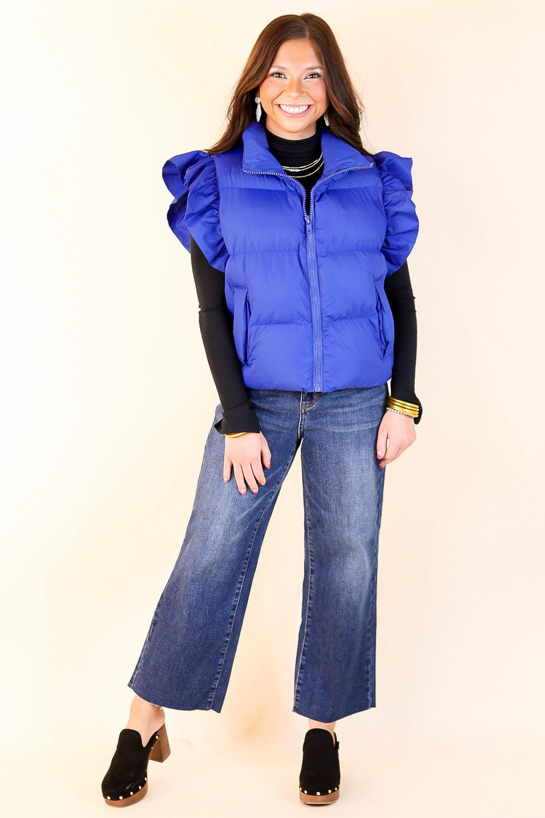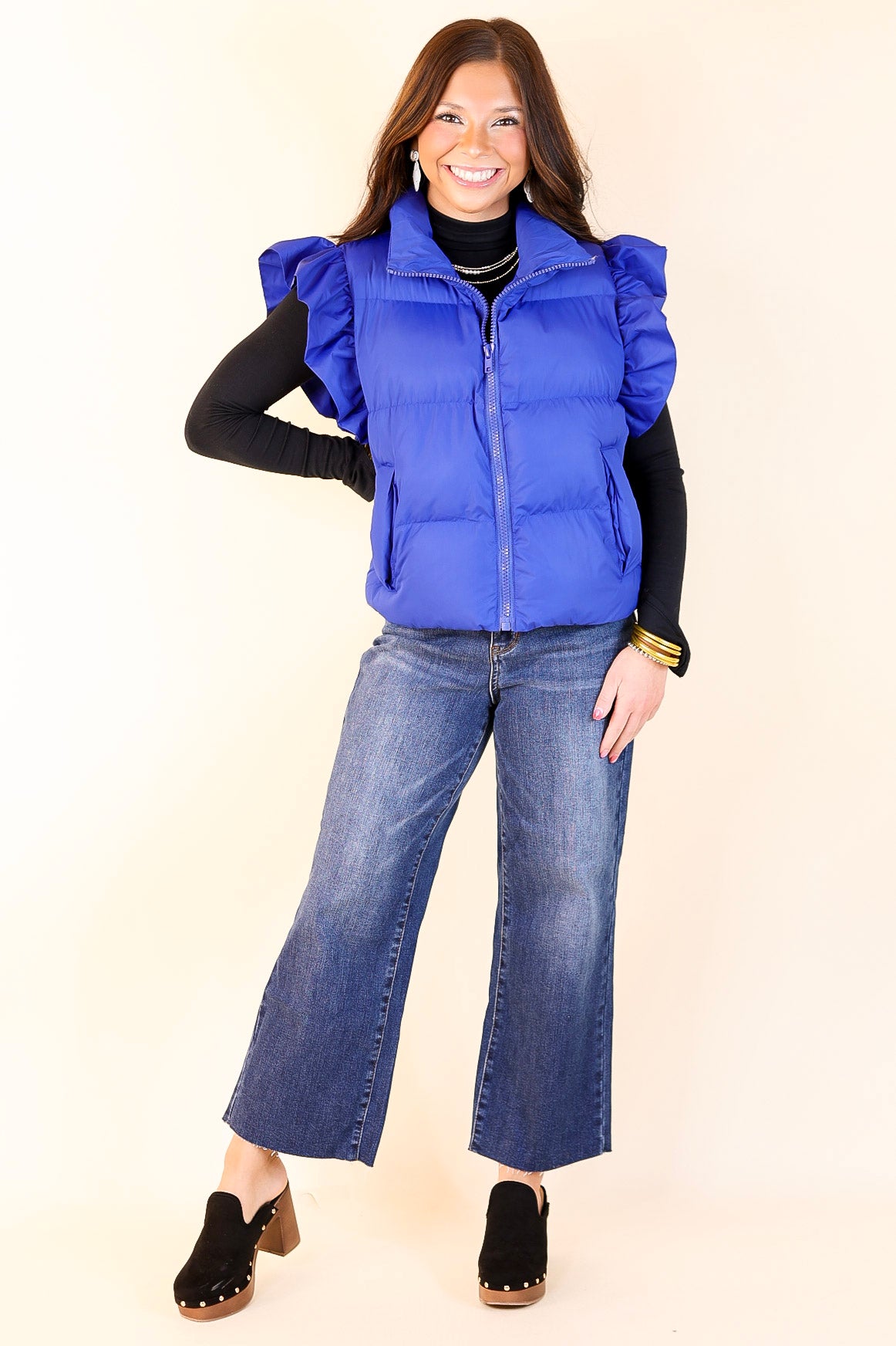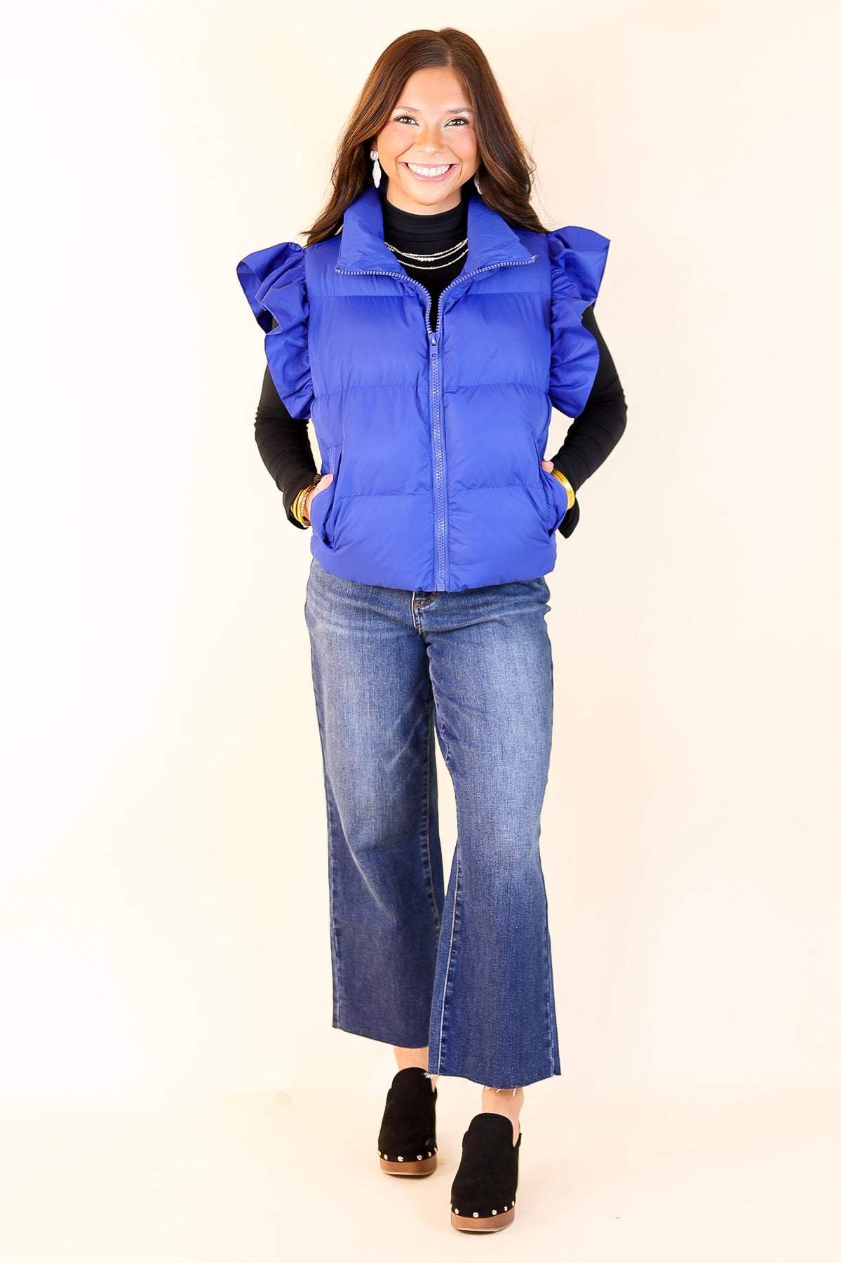 Meet the 'All Season Long' puffer vest — your go-to layer for every winter occasion. Designed with chic ruffle detailing on the cap sleeves and practical side pockets, this versatile vest adds a touch of elegance while keeping you cozy. The lightweight yet warm design makes it ideal for layering, ensuring you stay comfortable throughout the season. Embrace effortless style and warmth all season long with this must-have winter essential.