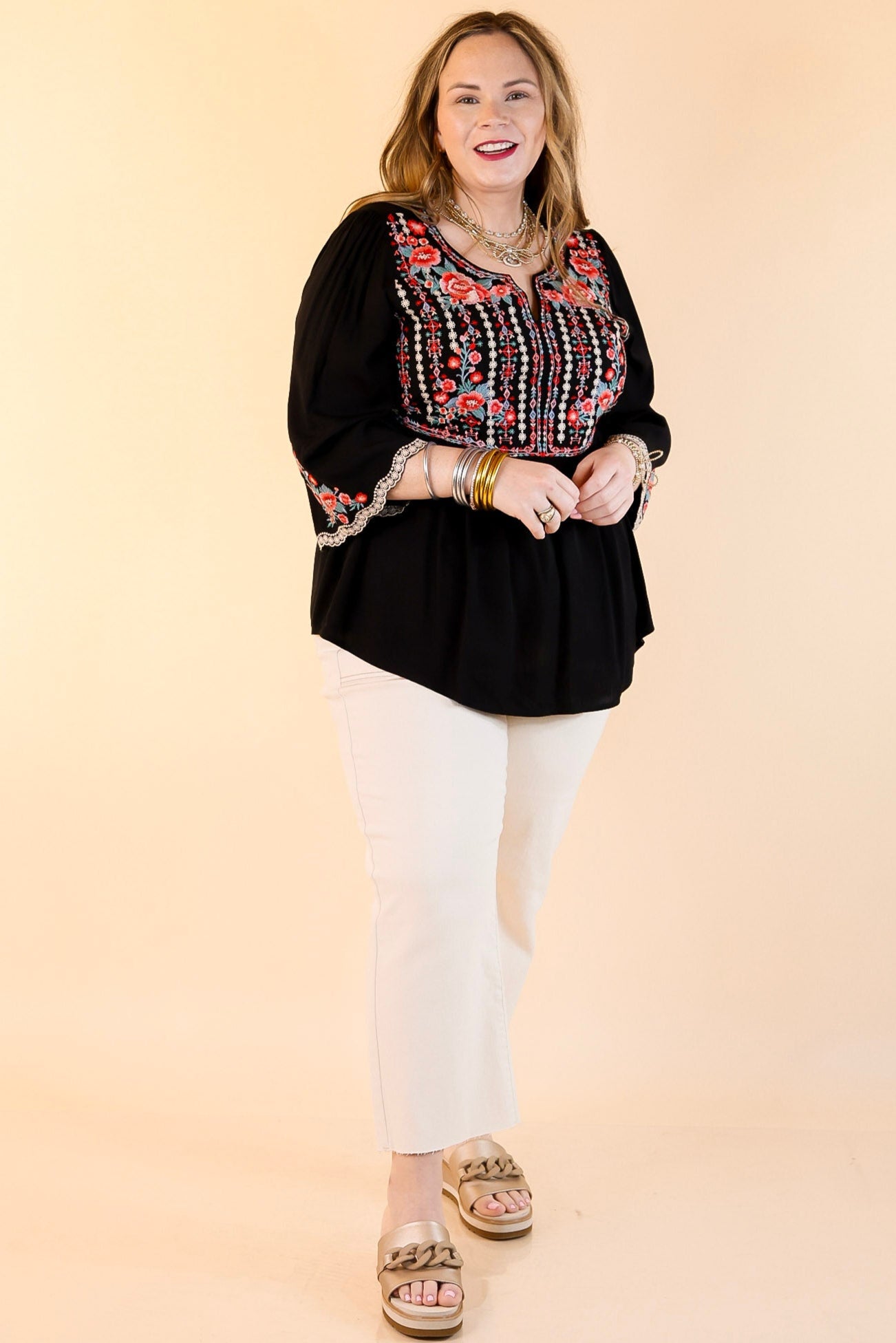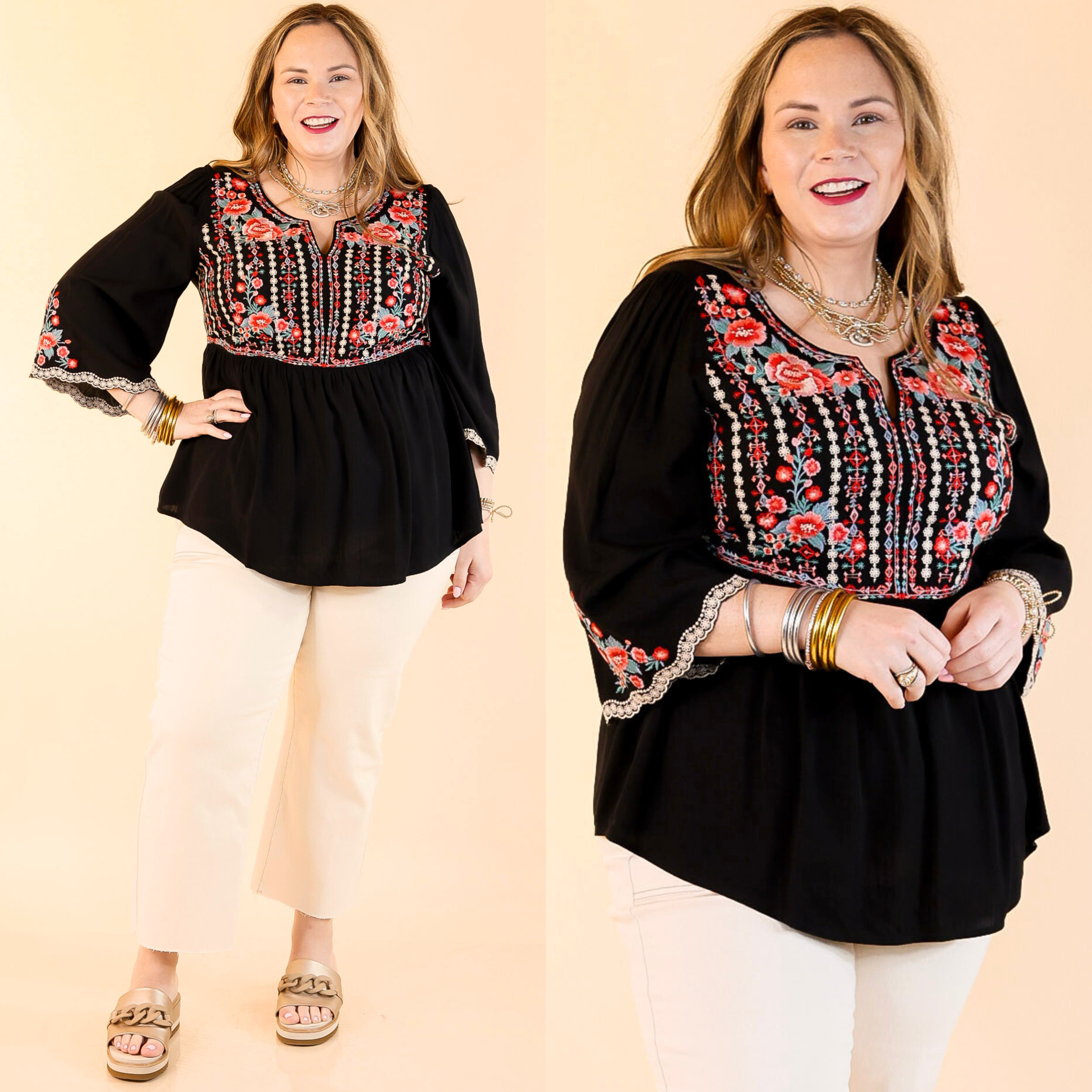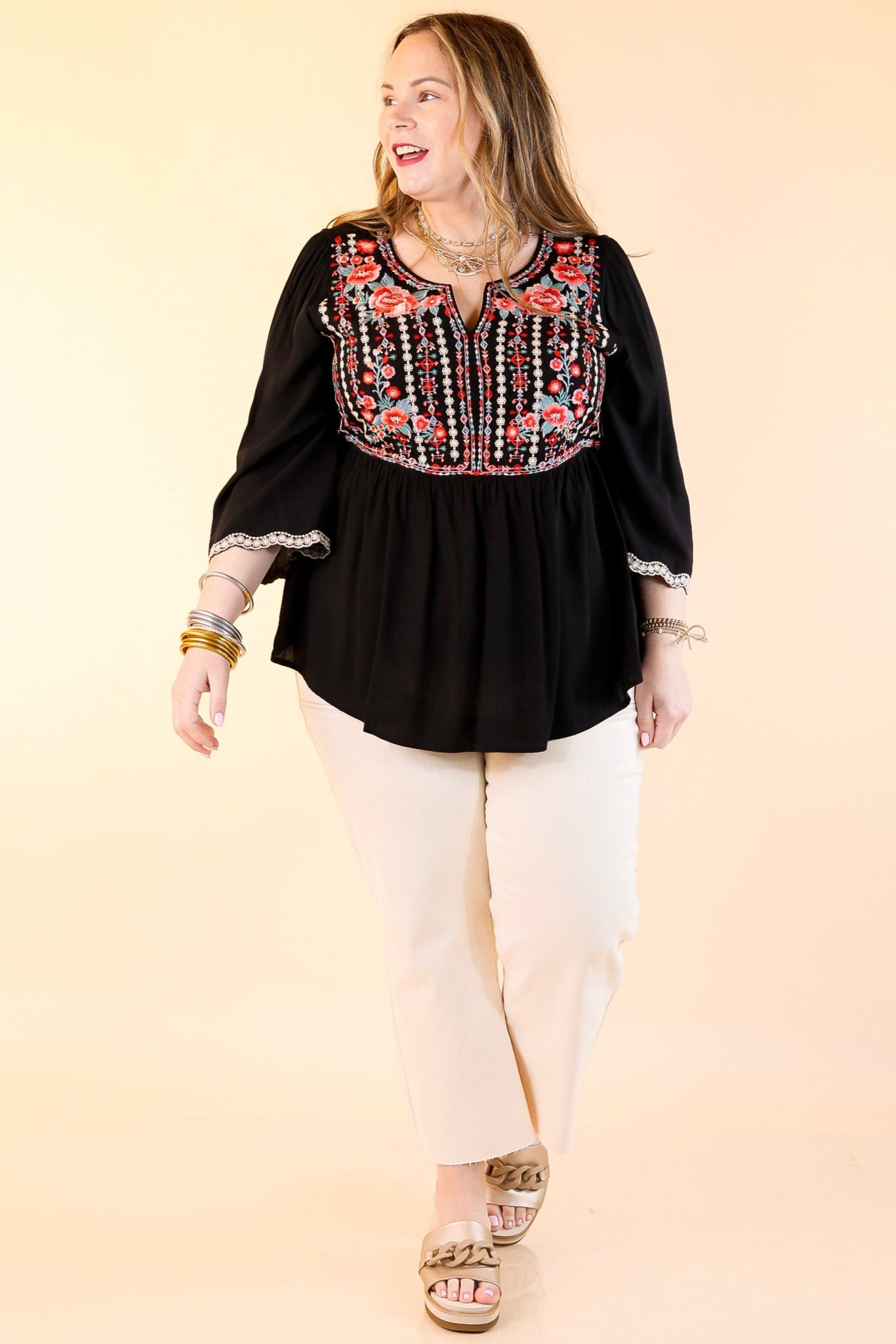 Already Mine 3/4 Bell Sleeve Embroidered Babydoll Top in Black