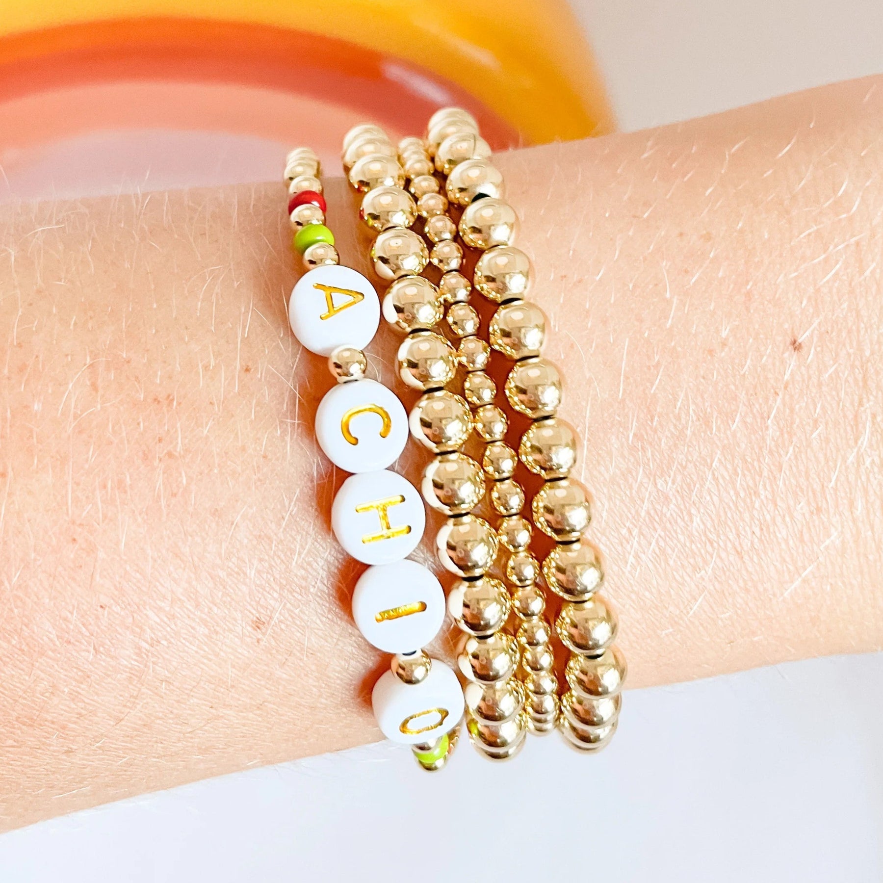 Calling all sorority girls! Do you want a fun way to represent your sorority daily? This is our custom made beaded bracelet with your sorority name and colors! Get this for you, your little, your future little, or even a gift for a sister! 14K gold filled beads, letter beads, Czech glass beads and durable elastic string. These bracelets are handstrung with love in College Station, Texas.