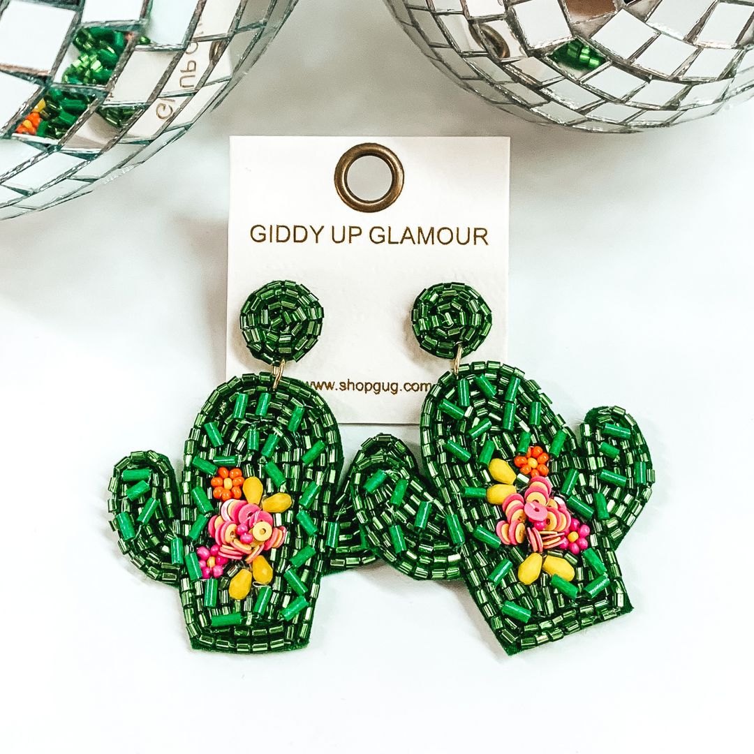 Beaded Cactus Earrings with Beaded Flowers in Green