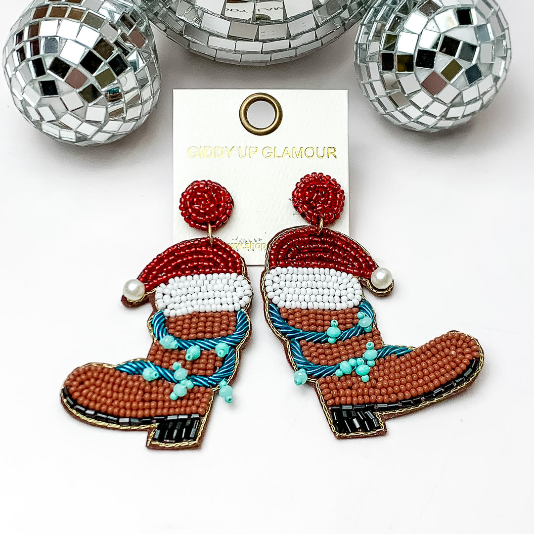 Beaded Cowboy Boot Earrings with Santa Hat in Brown