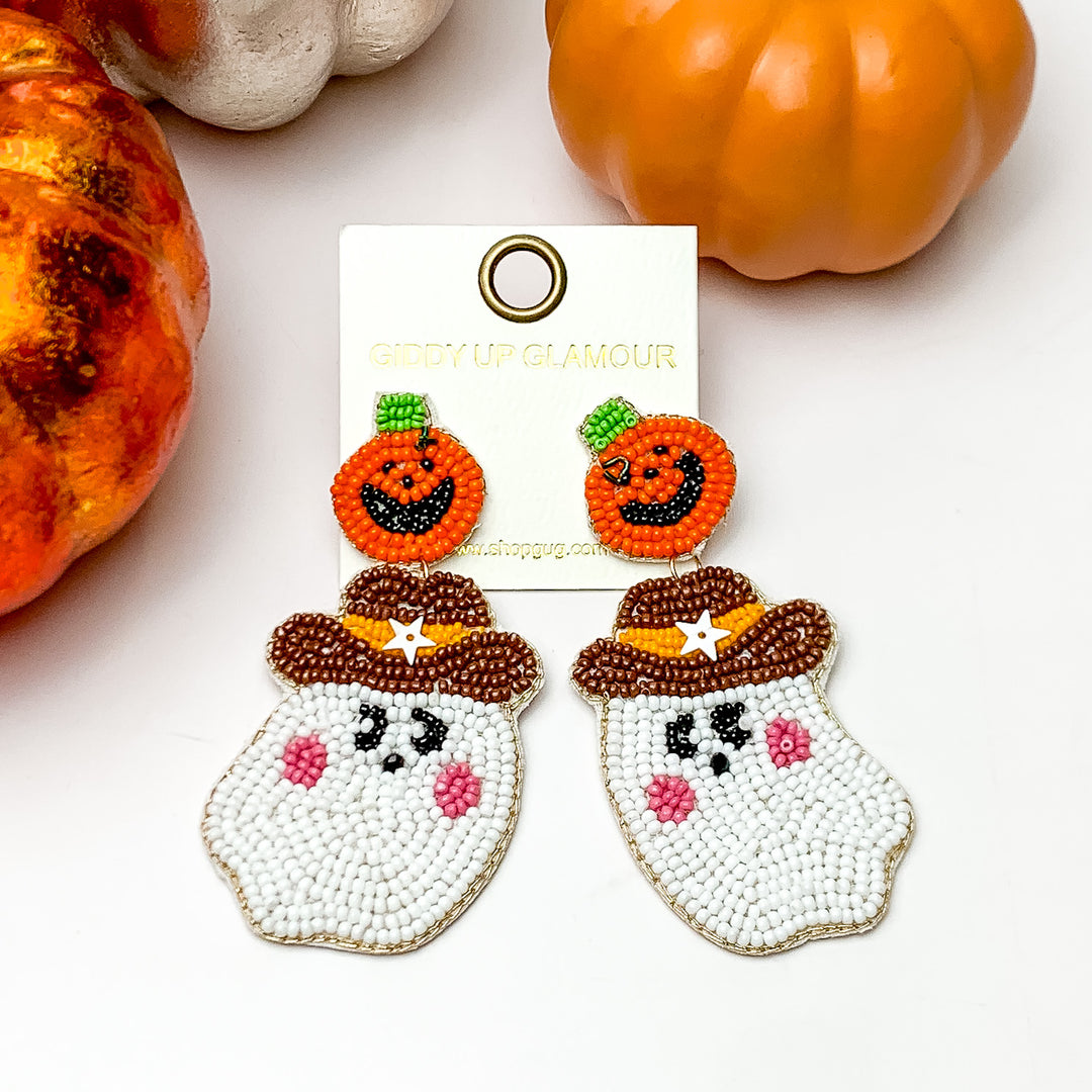 Beaded Cowboy Ghost Earrings with Orange Pumpkin Studs in White
