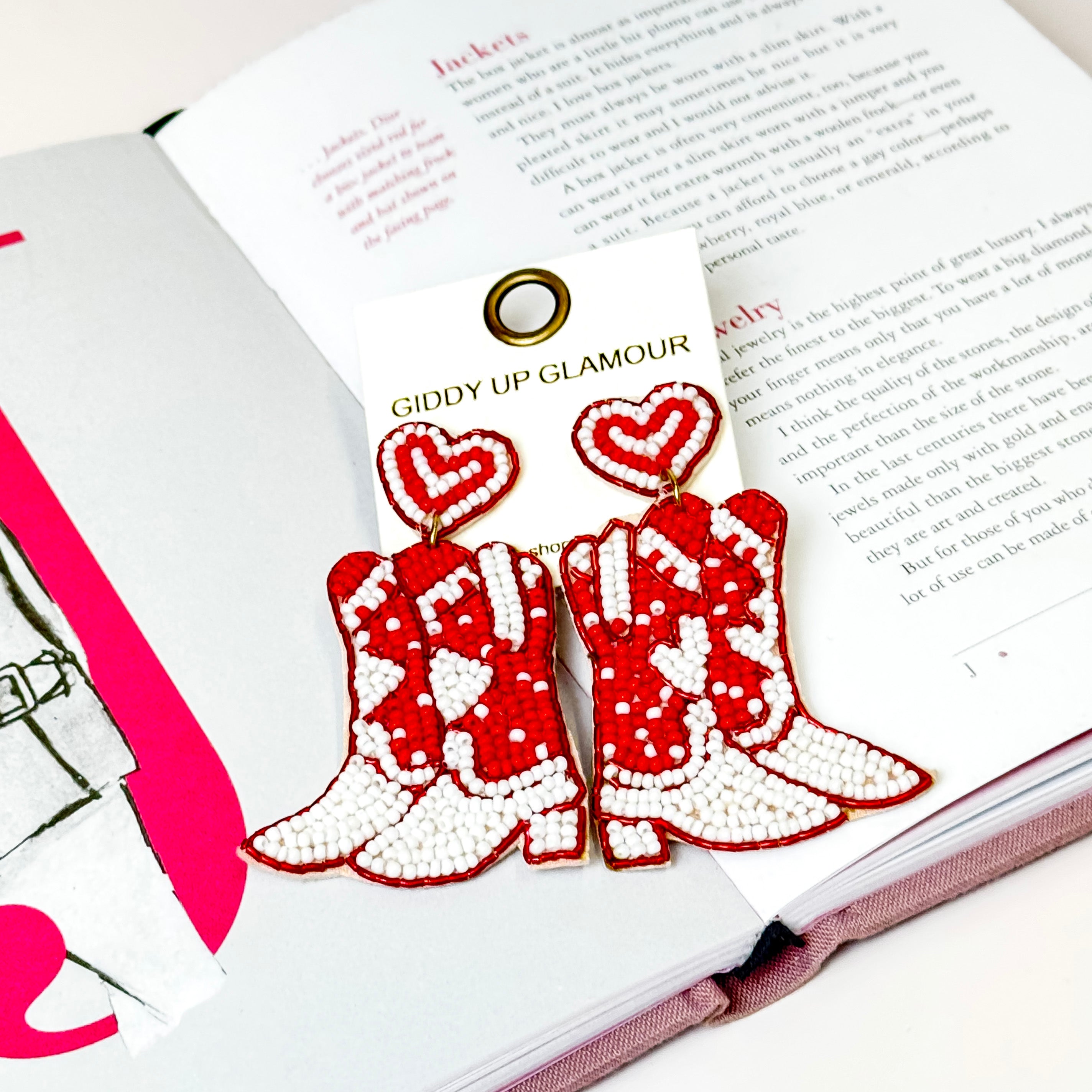 Beaded Heart Post Cowboy Boots Earrings in Red and White