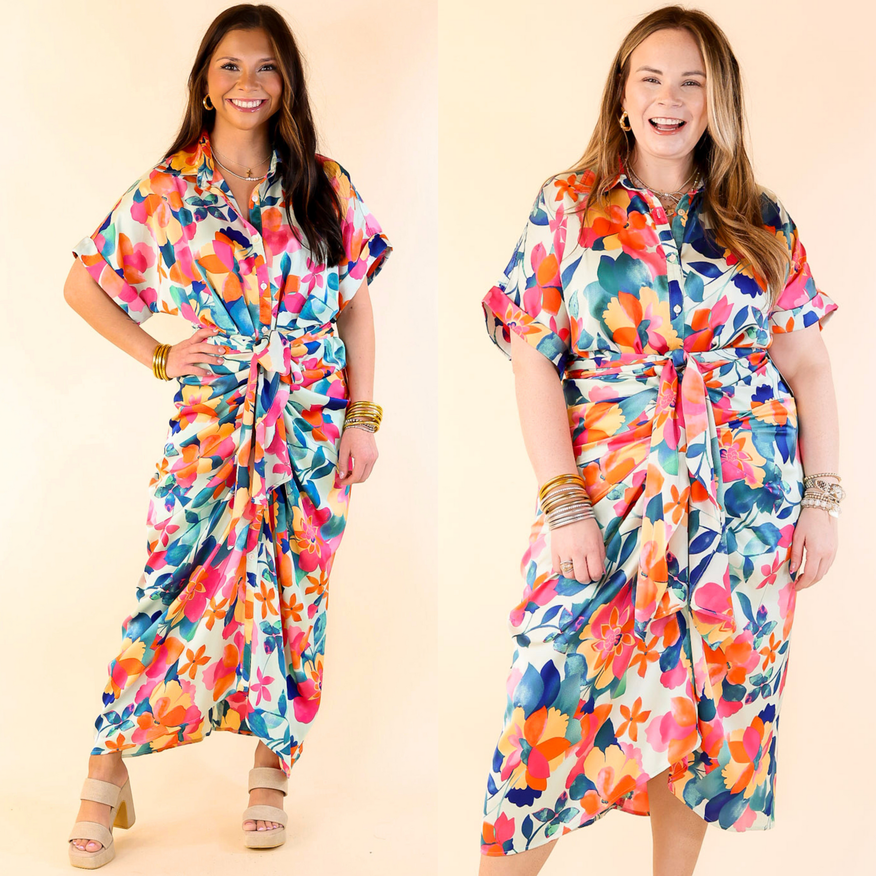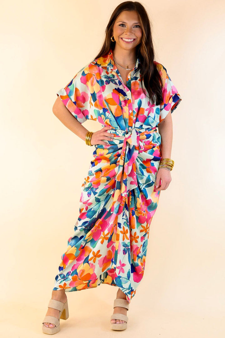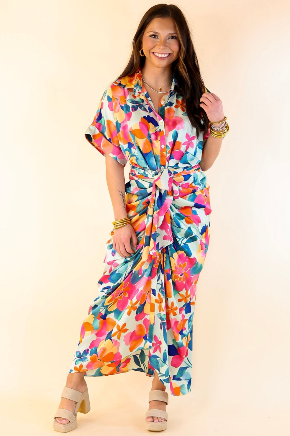 Put a spring in your step with Beautiful Flora, the perfect maxi dress for any occasion! The bright, cheery floral design will make you smile without even trying and the button-up front and cuffed sleeves keep things both practical and stylish. Plus, the waist tie will have you looking trim and feeling confident no matter where you're heading. So why wait? Get this dress and show the world you mean business.