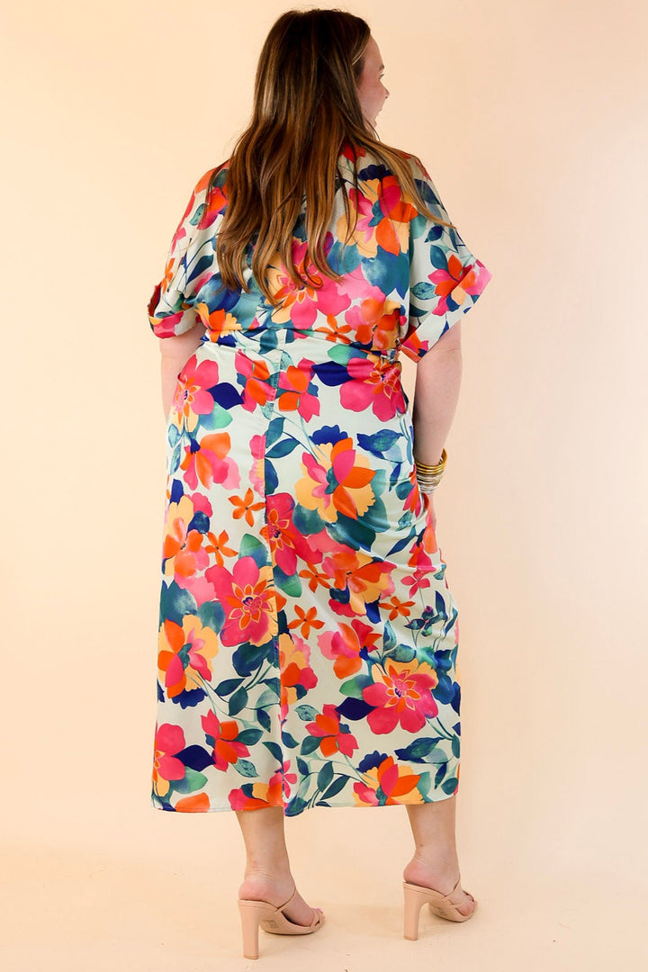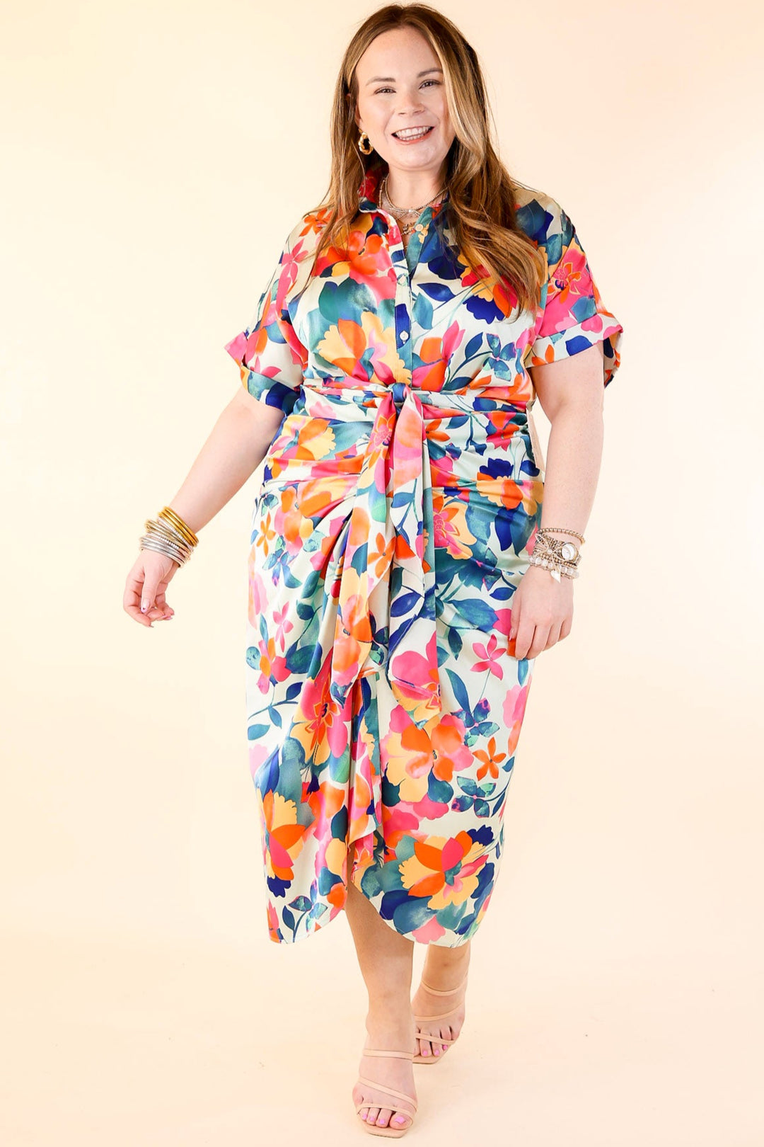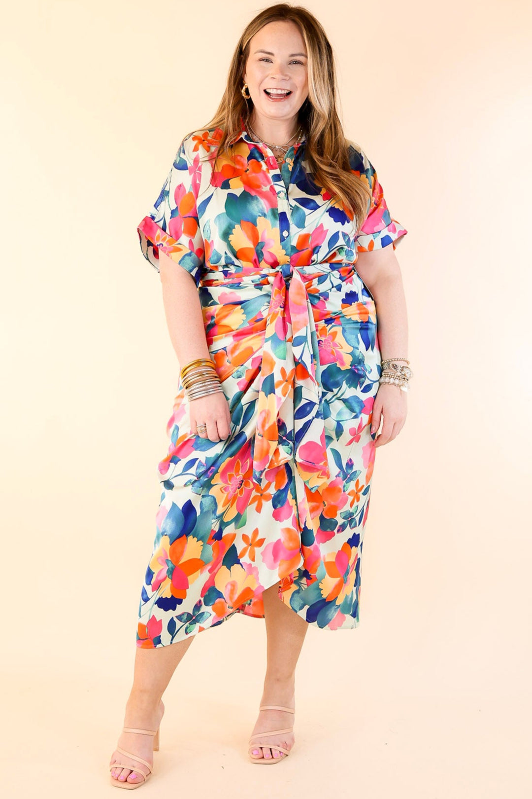 Put a spring in your step with Beautiful Flora, the perfect maxi dress for any occasion! The bright, cheery floral design will make you smile without even trying and the button-up front and cuffed sleeves keep things both practical and stylish. Plus, the waist tie will have you looking trim and feeling confident no matter where you're heading. So why wait? Get this dress and show the world you mean business.