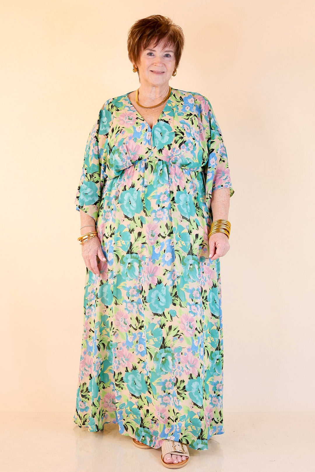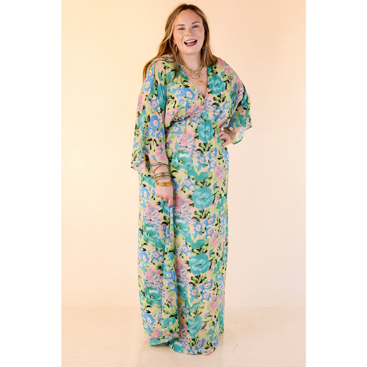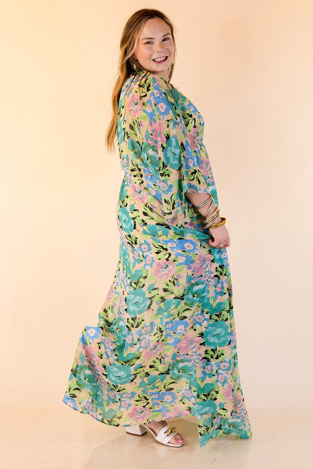 Beautifully Botanical V Neck Floral Print Maxi Dress in Blue and Green Mix
