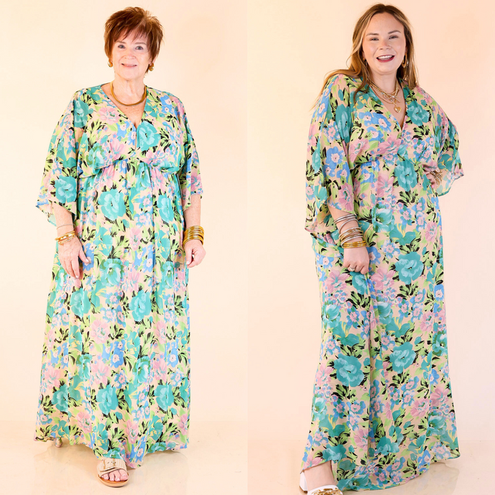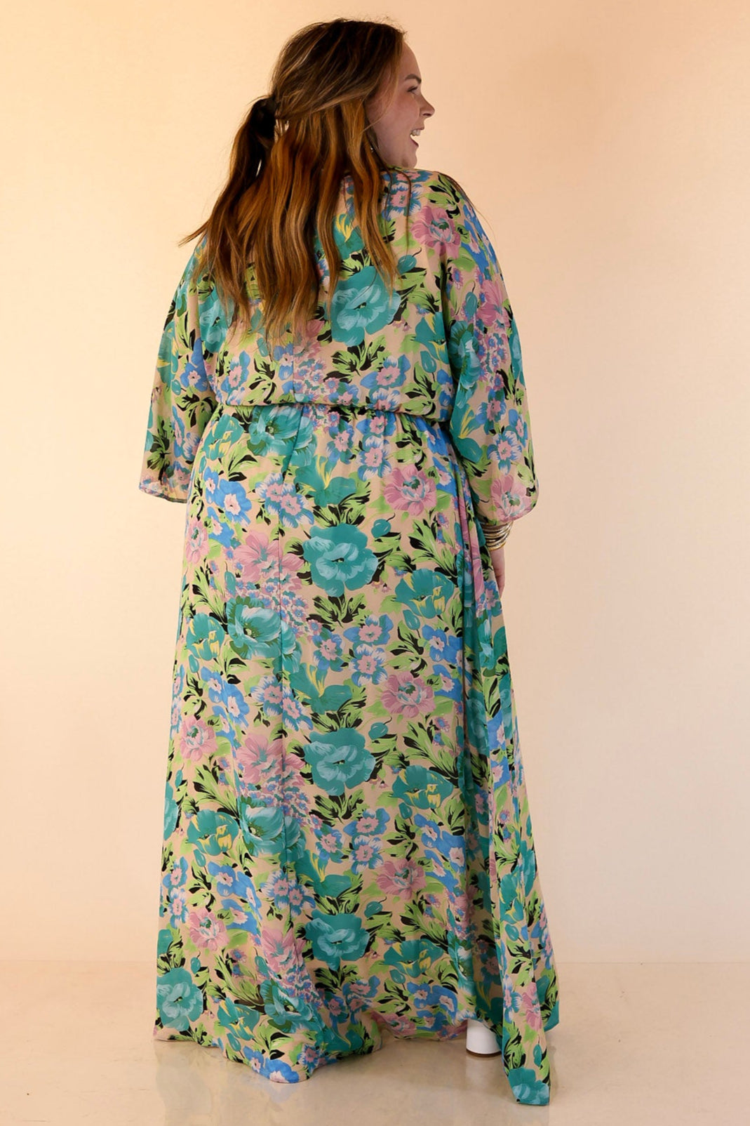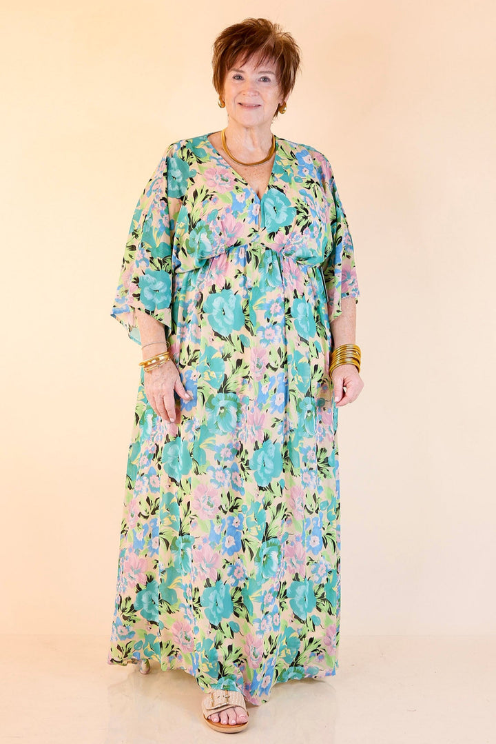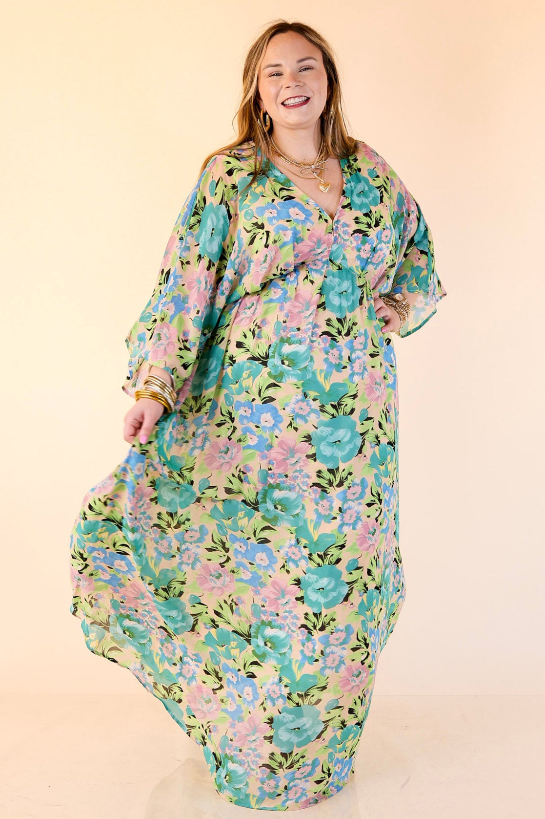 Beautifully Botanical V Neck Floral Print Maxi Dress in Blue and Green Mix