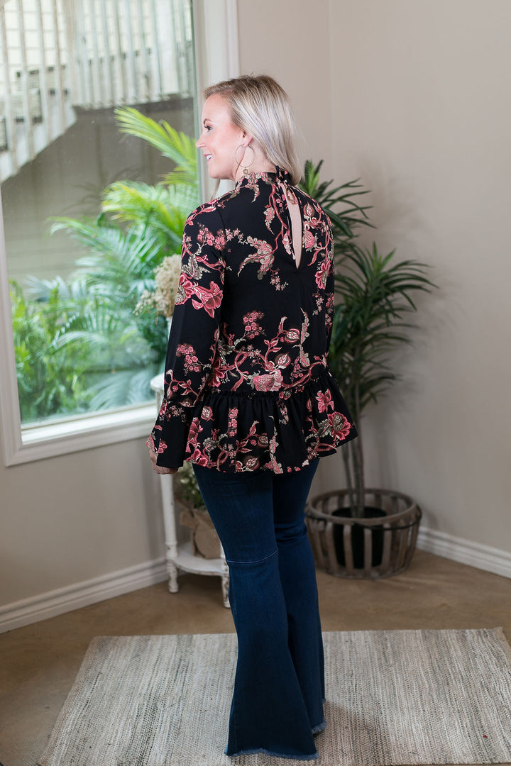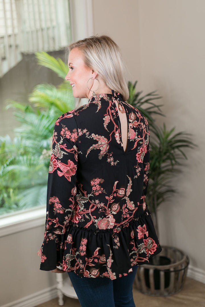 Last Chance Size Small | Here She Comes Floral Keyhole Top with Ruffle in Black