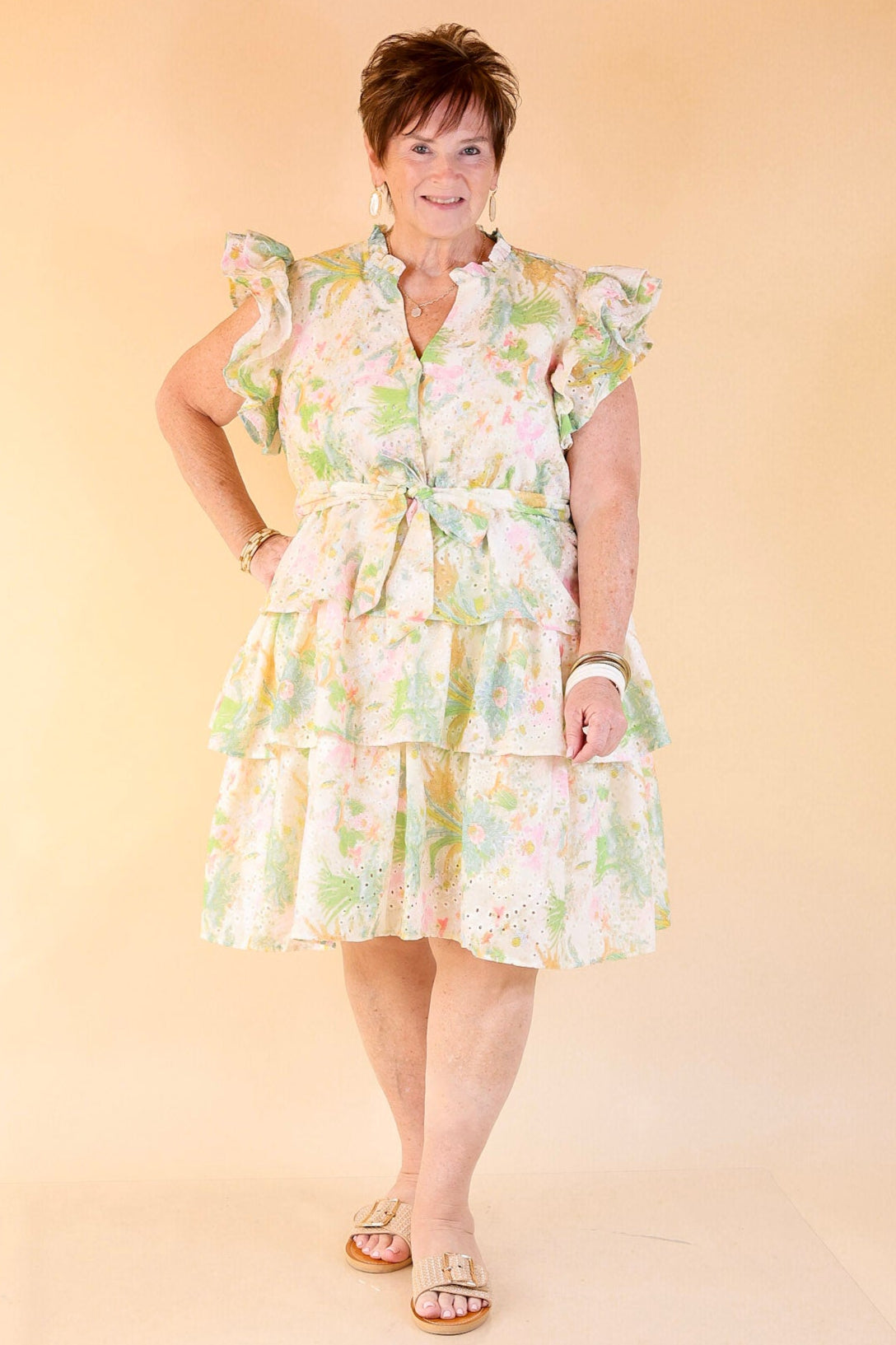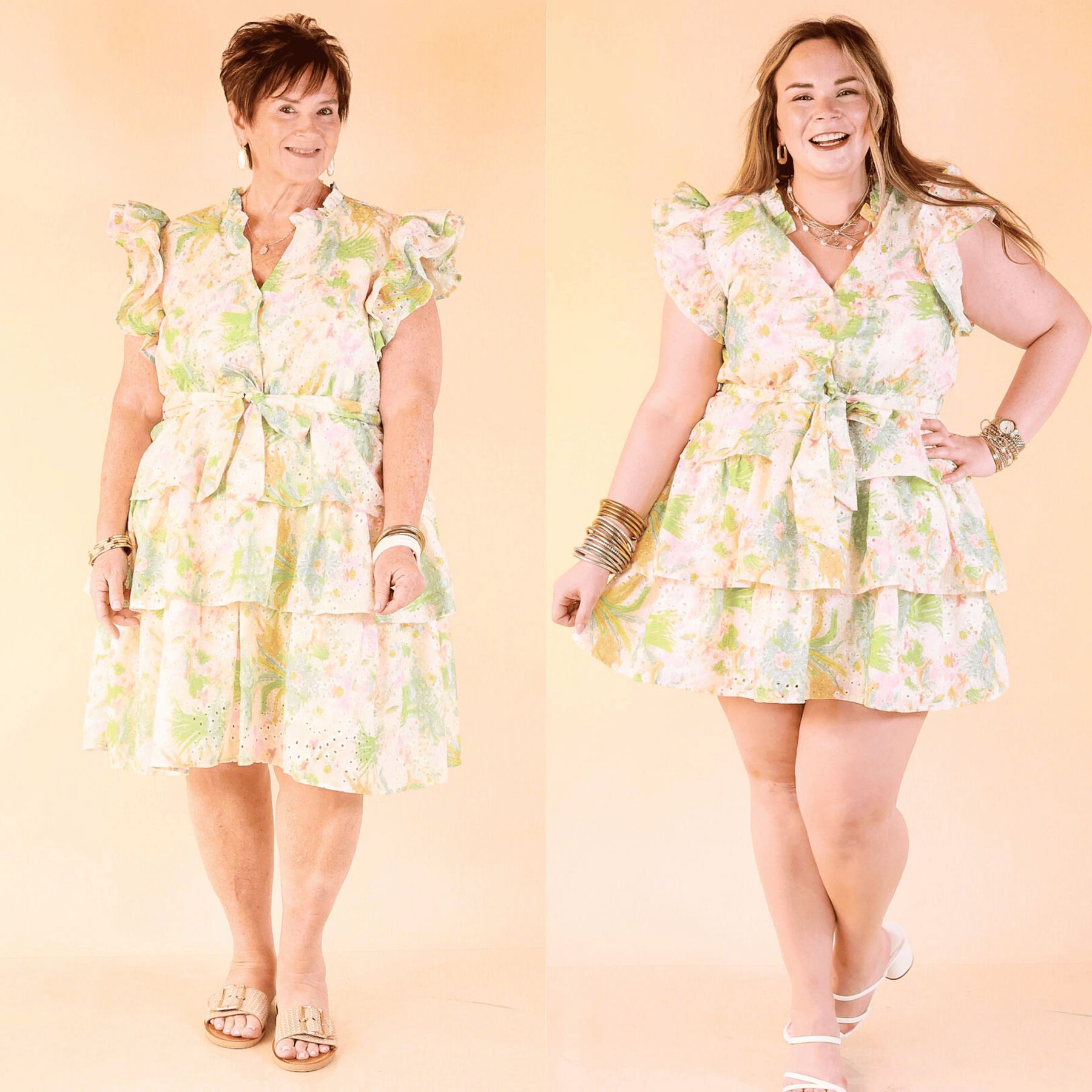 A floral moment that’s flirty, feminine, and full of charm. The Blooming in Bows dress features a flattering V-neckline, ruffle sleeves, and a tiered skirt that moves with you. The cinched waist ties into a pretty bow, giving you that effortlessly put-together look. With eyelet detailing and a soft floral print in shades of green and more, this dress is made for twirling through sunny days, brunch dates, and everything in between.