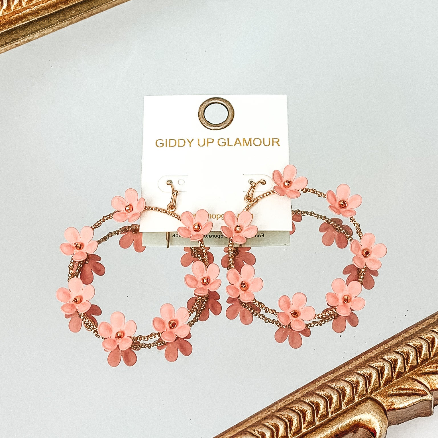 Gold, open circle drop earrings with light pink flower charms outlining the earrings. These flowers have a gold bead center. These earrings are pictured laying on a gold mirror on the white background.