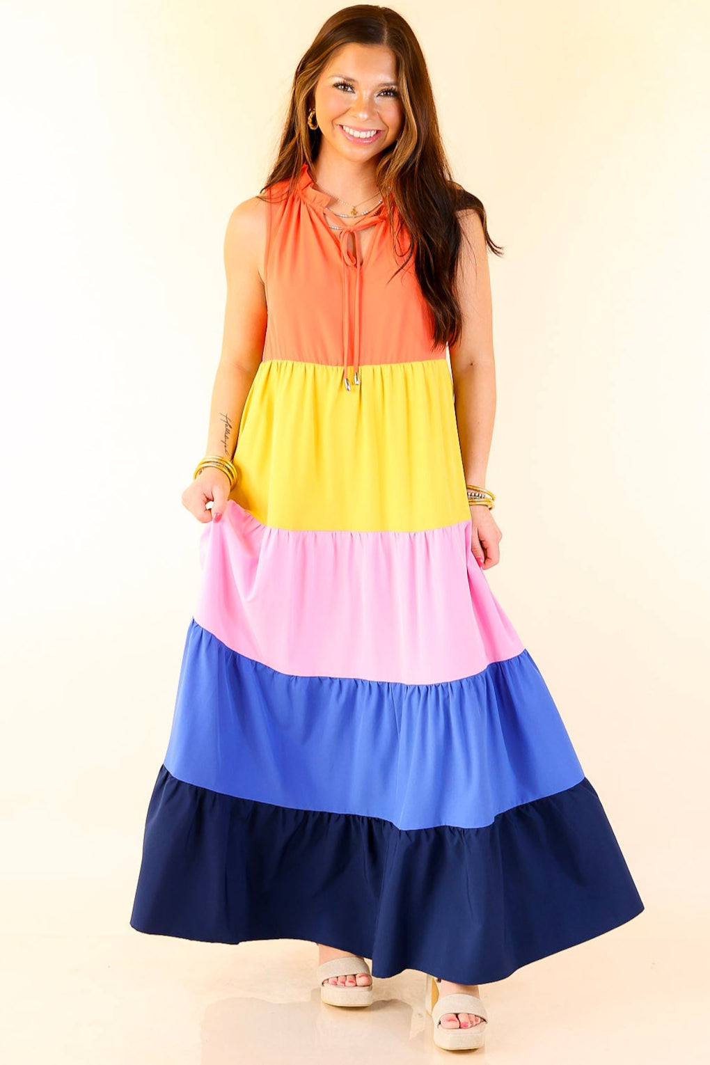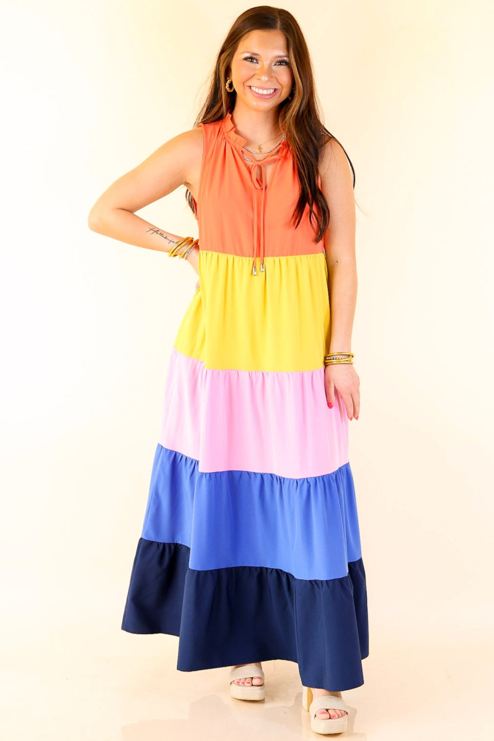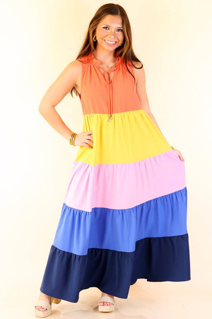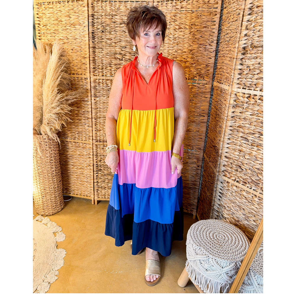 This gorgeous dress are giving us "walk on the beach" vibes! It includes a high neck with a notched neckline and tie, tank top upper, and different color tiers that are orange, yellow, lilac, royal blue , and navy blue. Dress is fully lined.