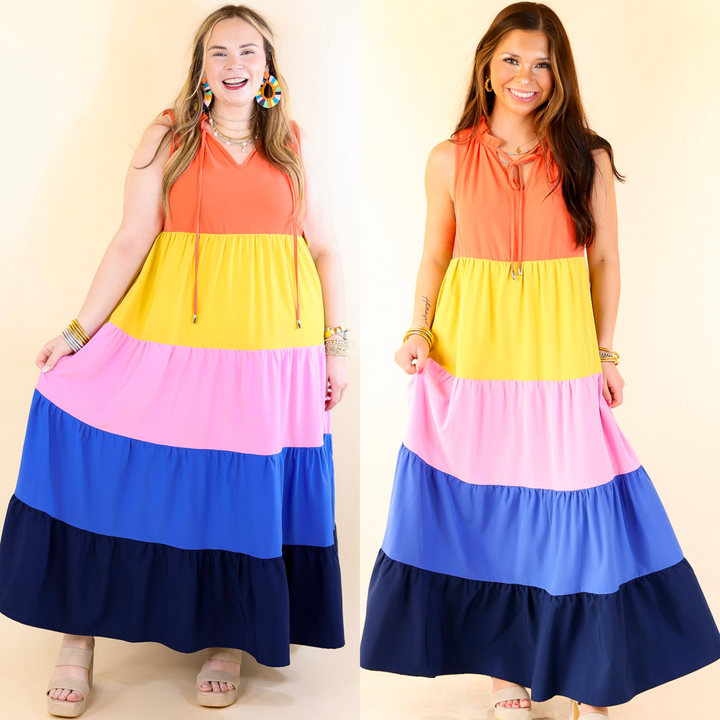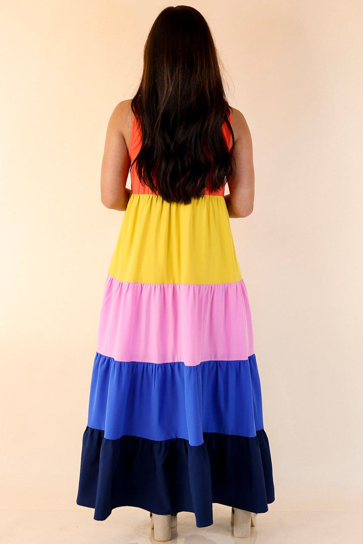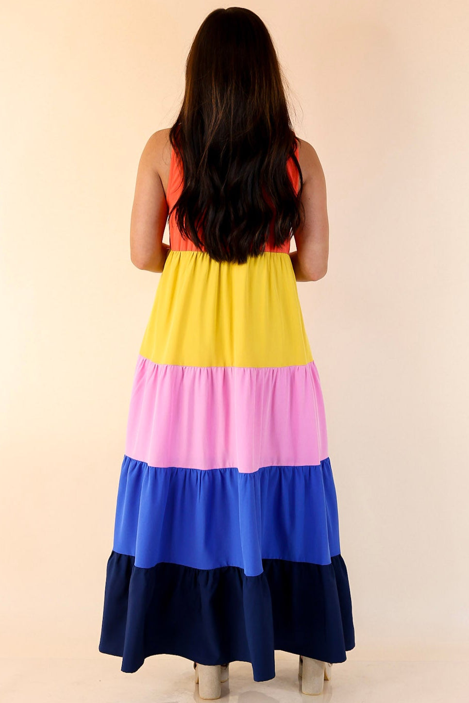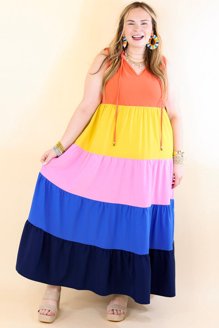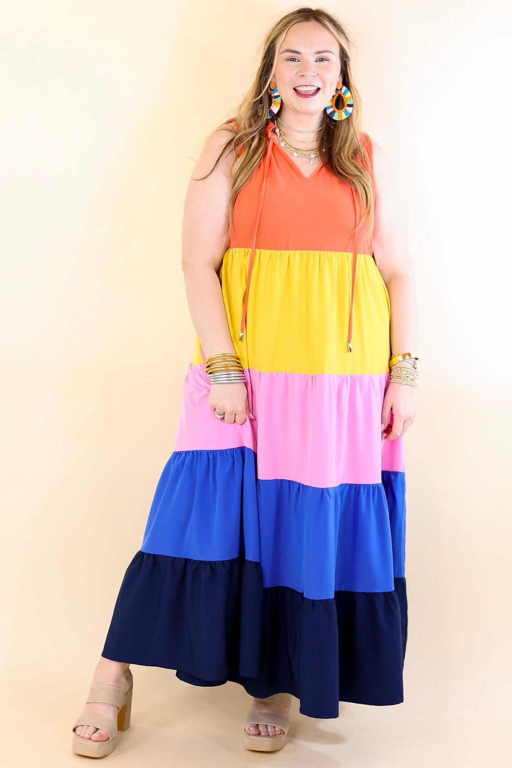 This gorgeous dress are giving us "walk on the beach" vibes! It includes a high neck with a notched neckline and tie, tank top upper, and different color tiers that are orange, yellow, lilac, royal blue , and navy blue. Dress is fully lined.