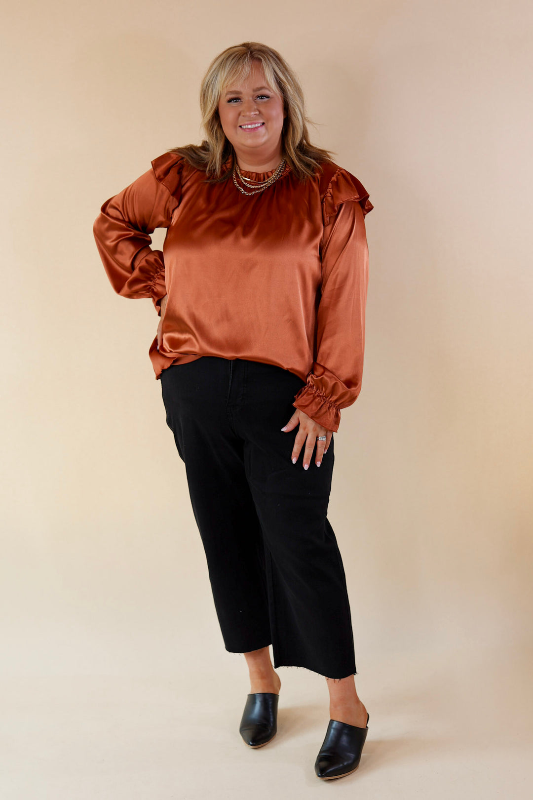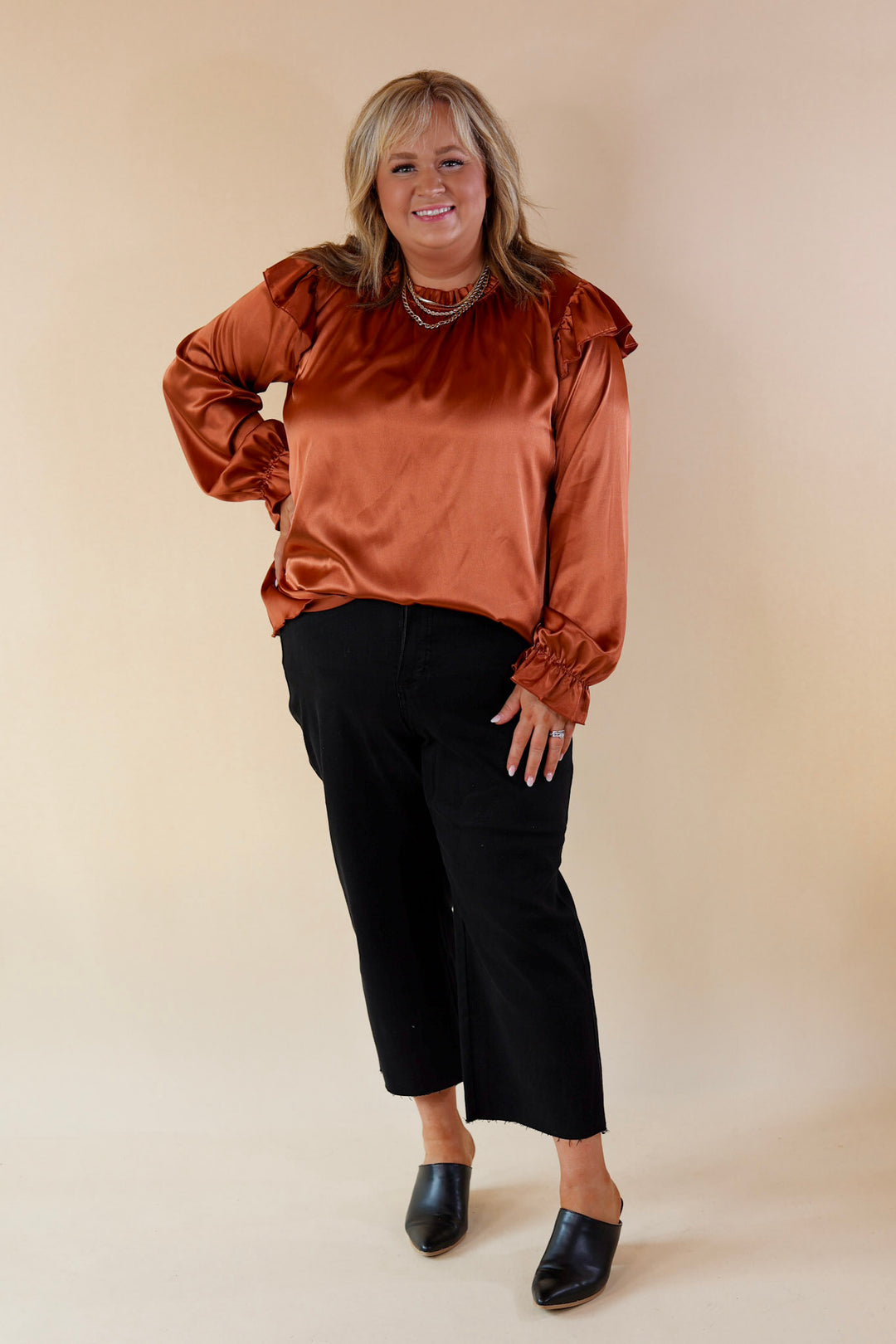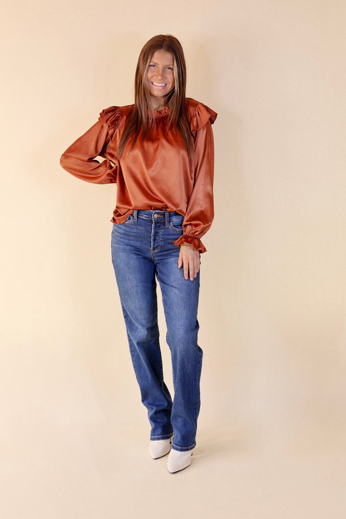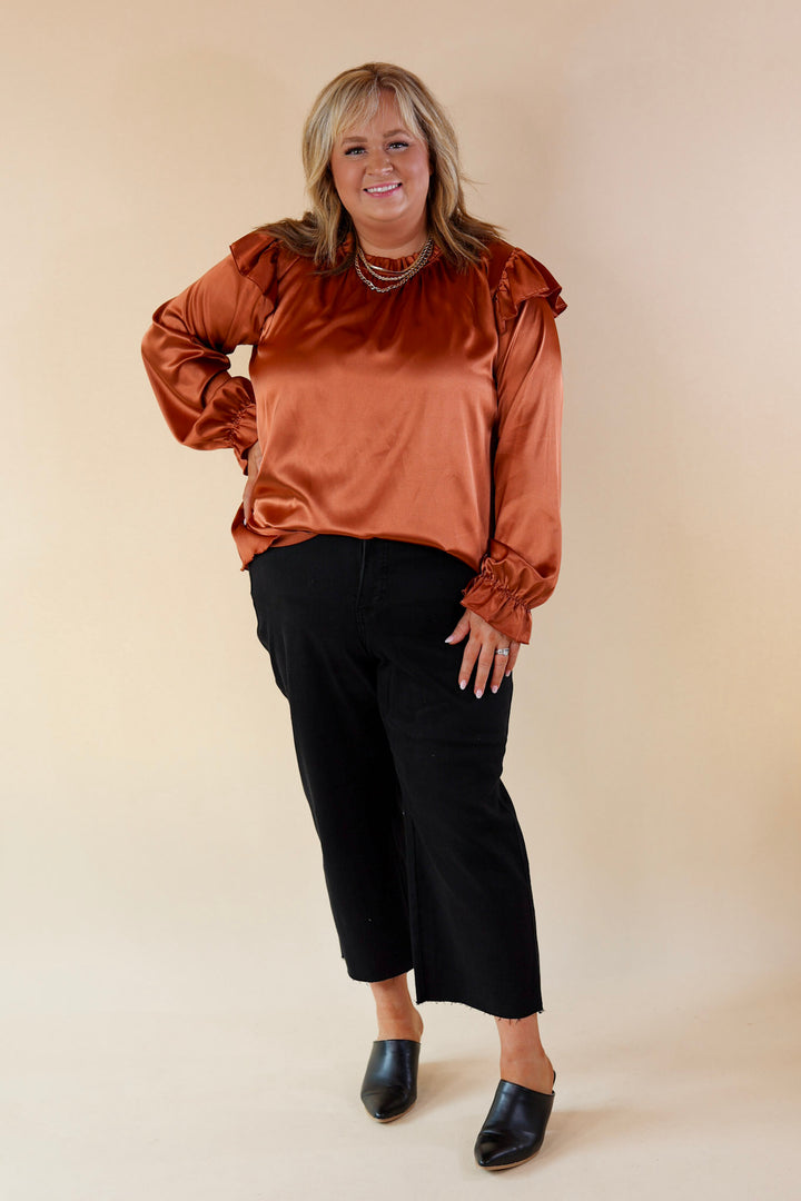 Can't Stop Me Ruffle Mock Neck Long Sleeve Satin Top in Rust Brown