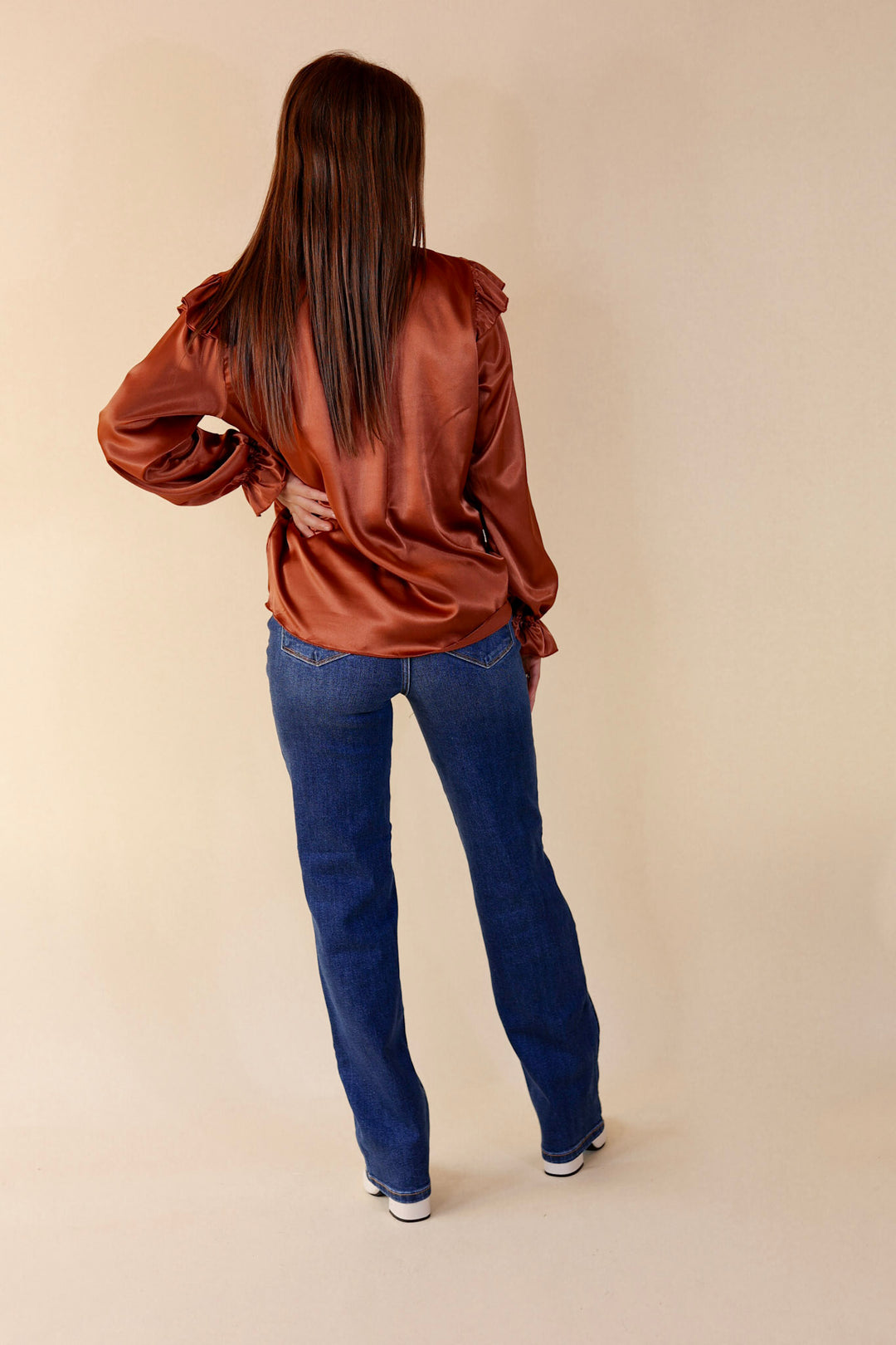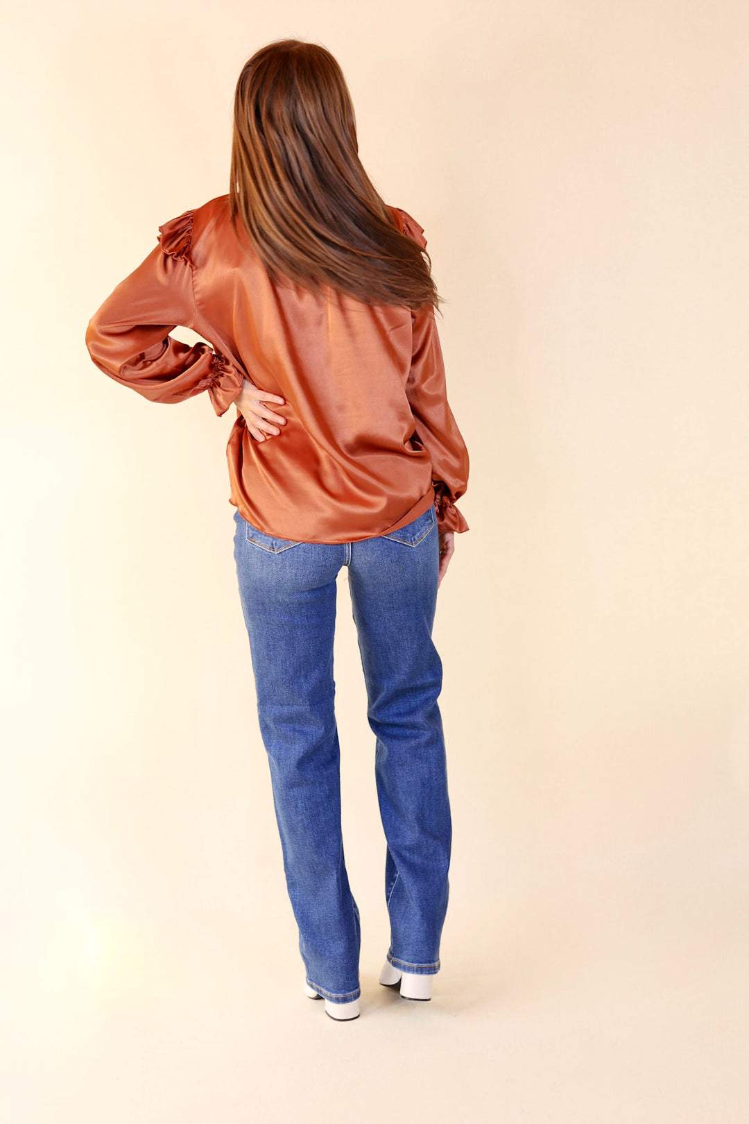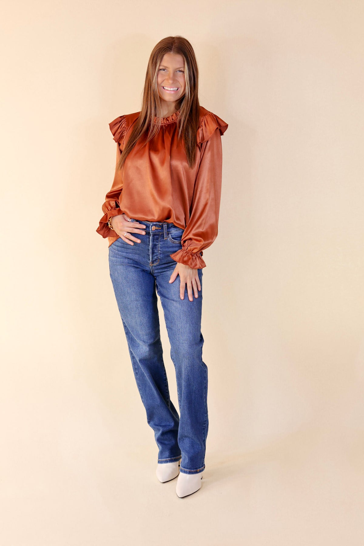 Can't Stop Me Ruffle Mock Neck Long Sleeve Satin Top in Rust Brown