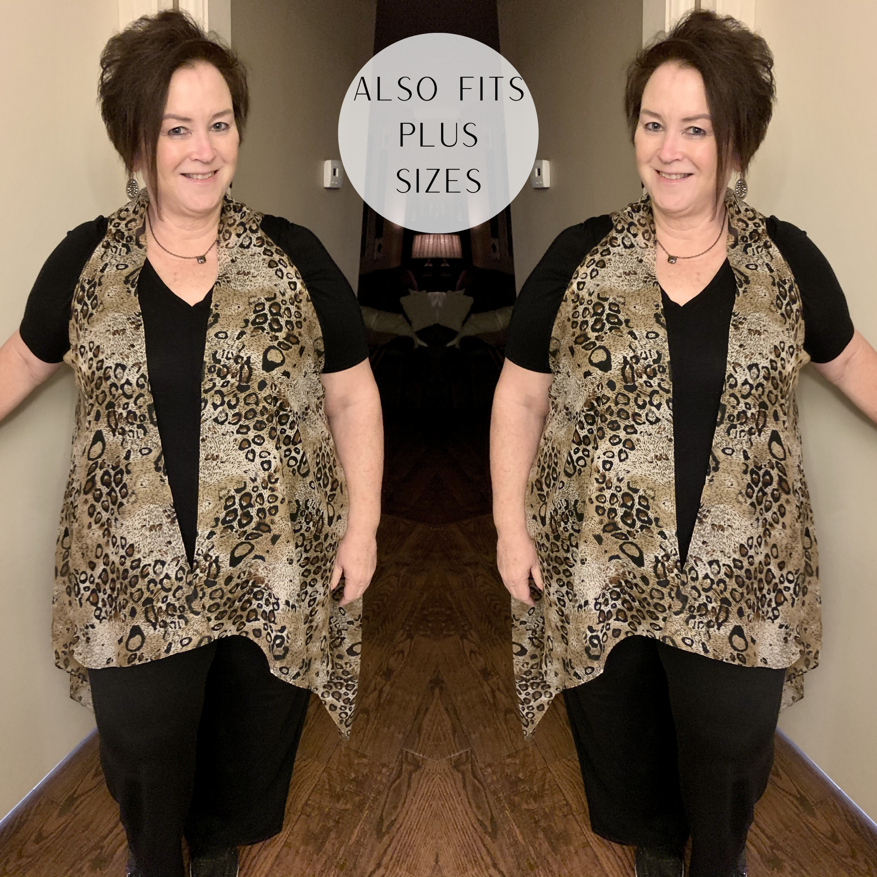 We can't stop adoring this cute vest and we won't stop because it is just that cute. This vest features an open front and one of our favorites, leopard. Nancy is wearing OS.