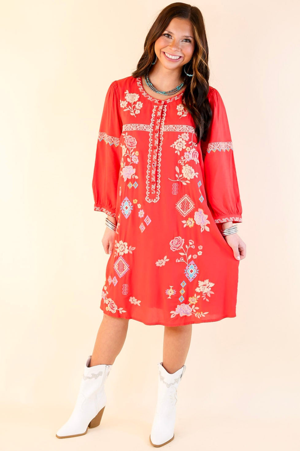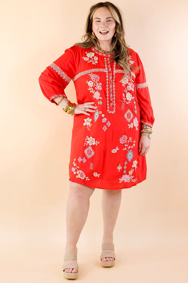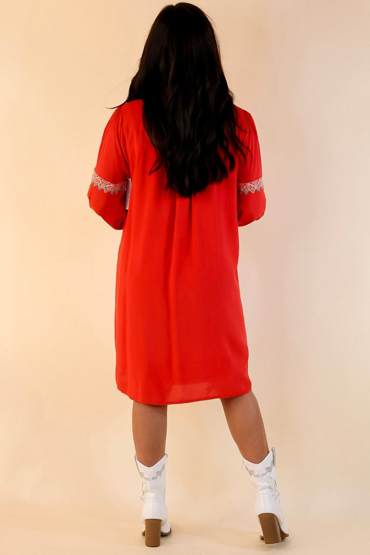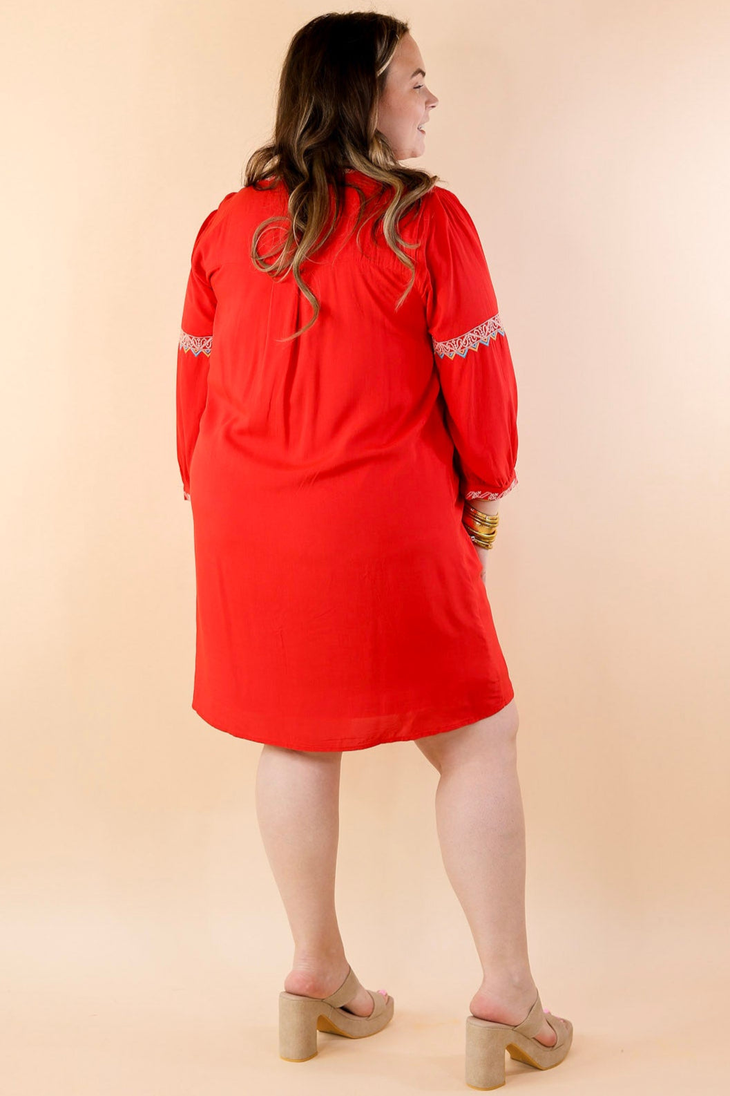 Chasing Sunshine Half Button Embroidered Dress with Half Sleeves in Red - Giddy Up Glamour Boutique