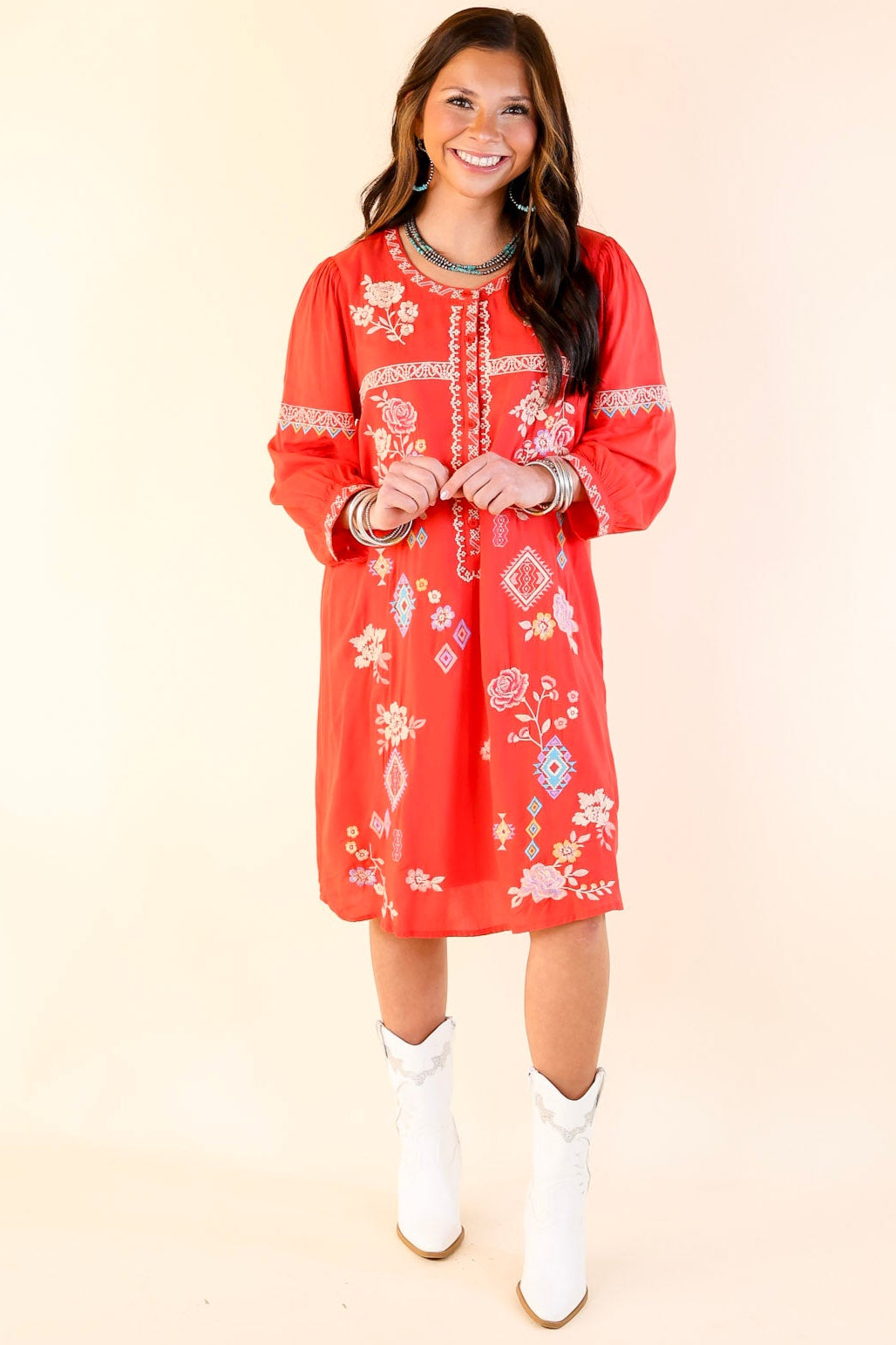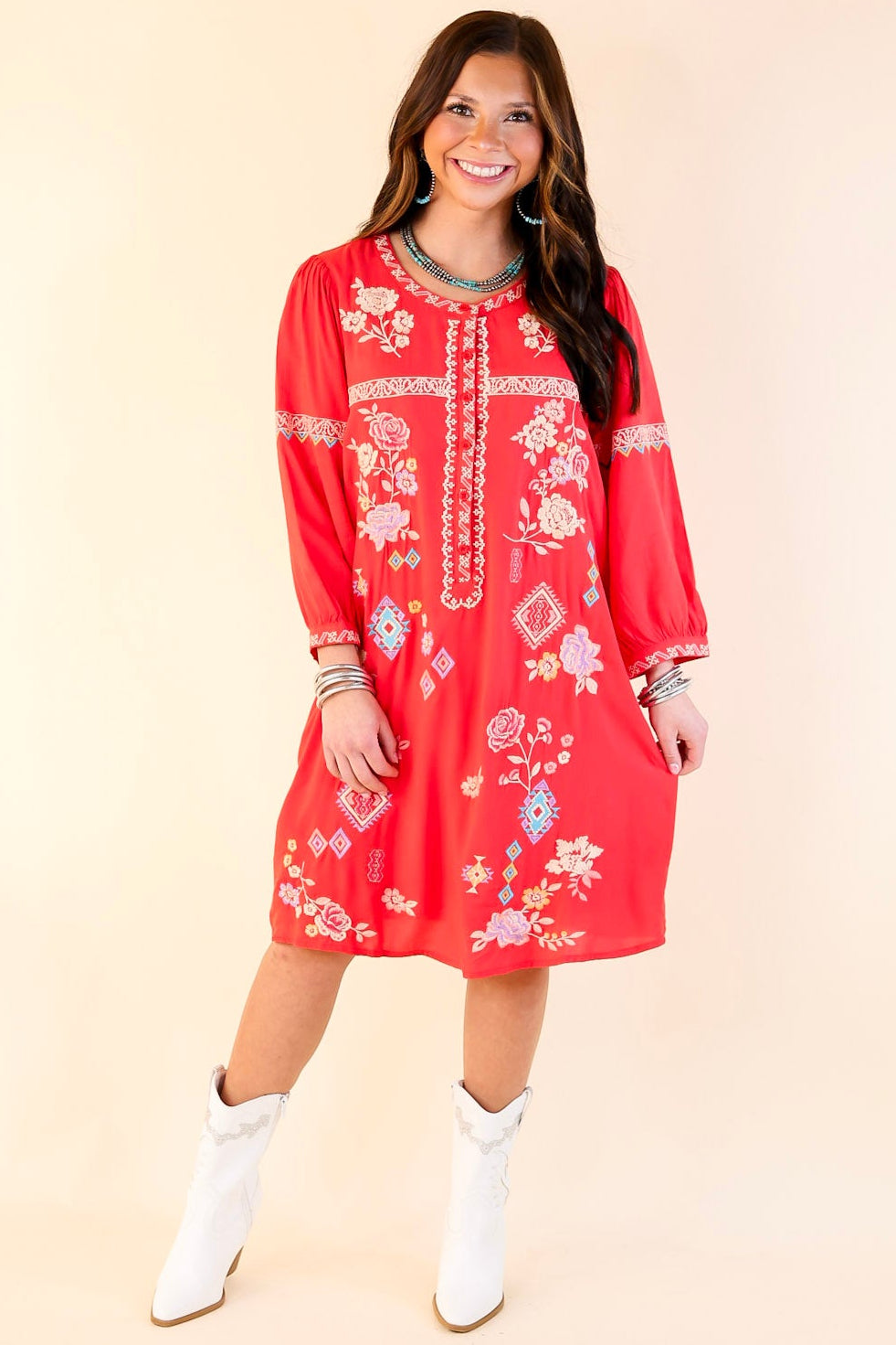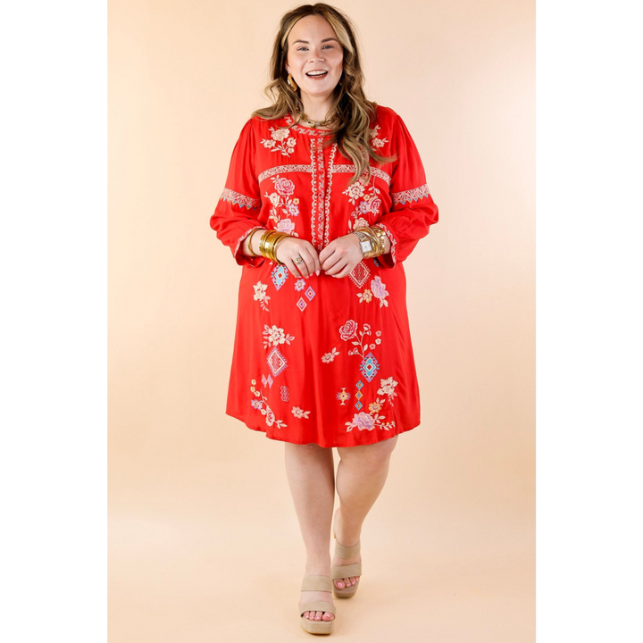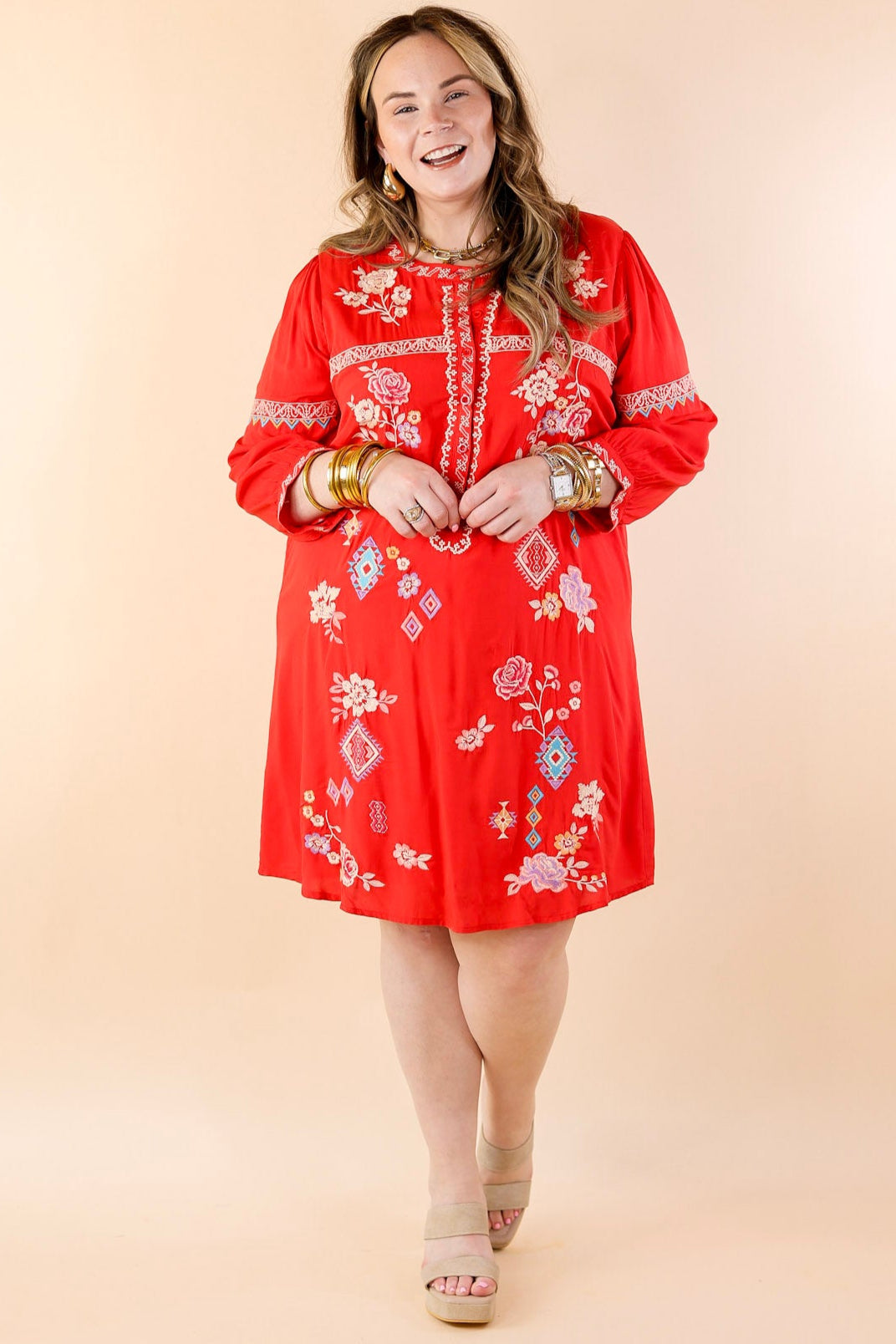 Chasing Sunshine Half Button Embroidered Dress with Half Sleeves in Red - Giddy Up Glamour Boutique