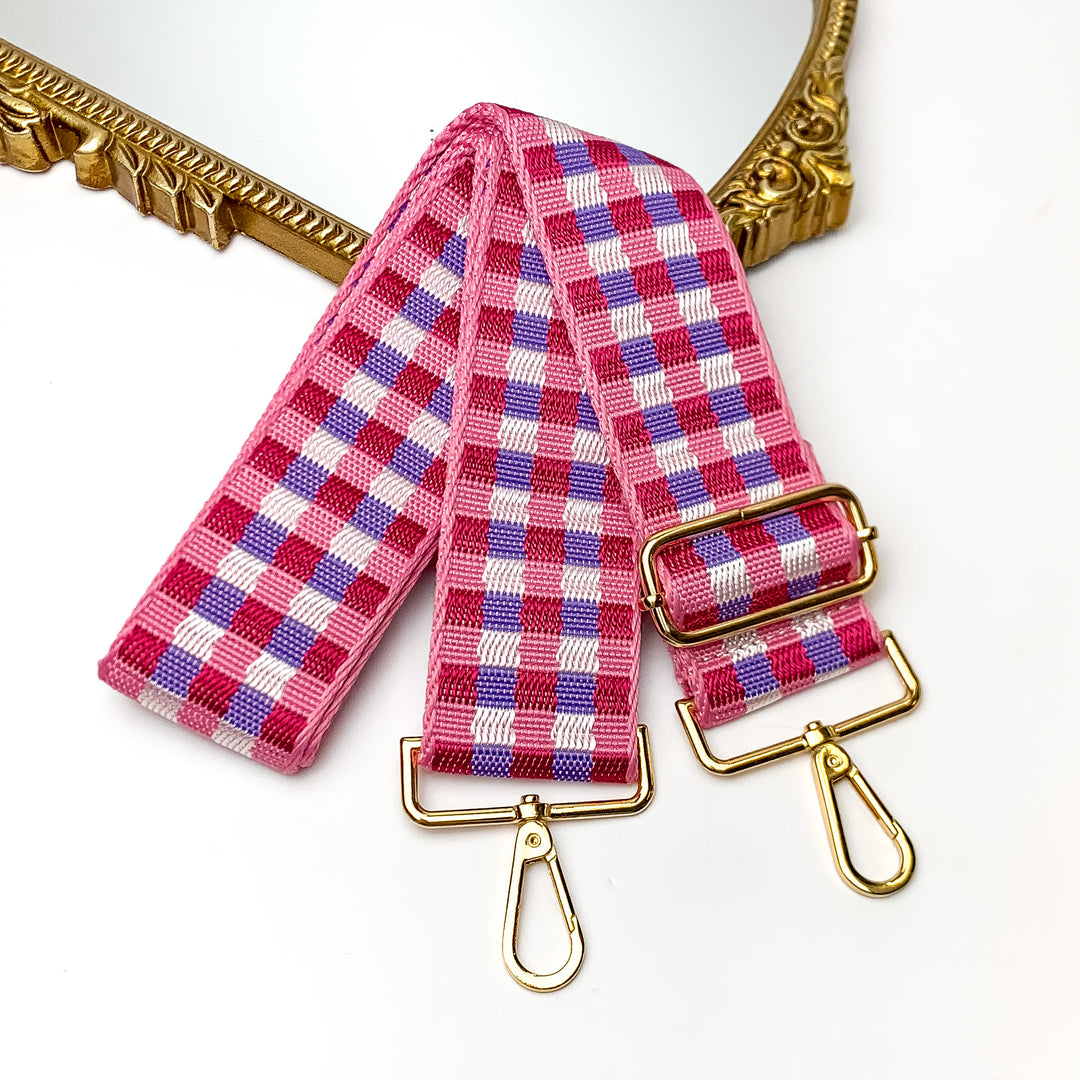 Checkered Adjustable Purse Strap in Pink, White, and Purple