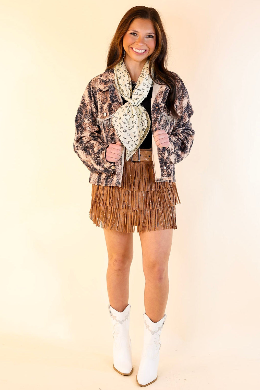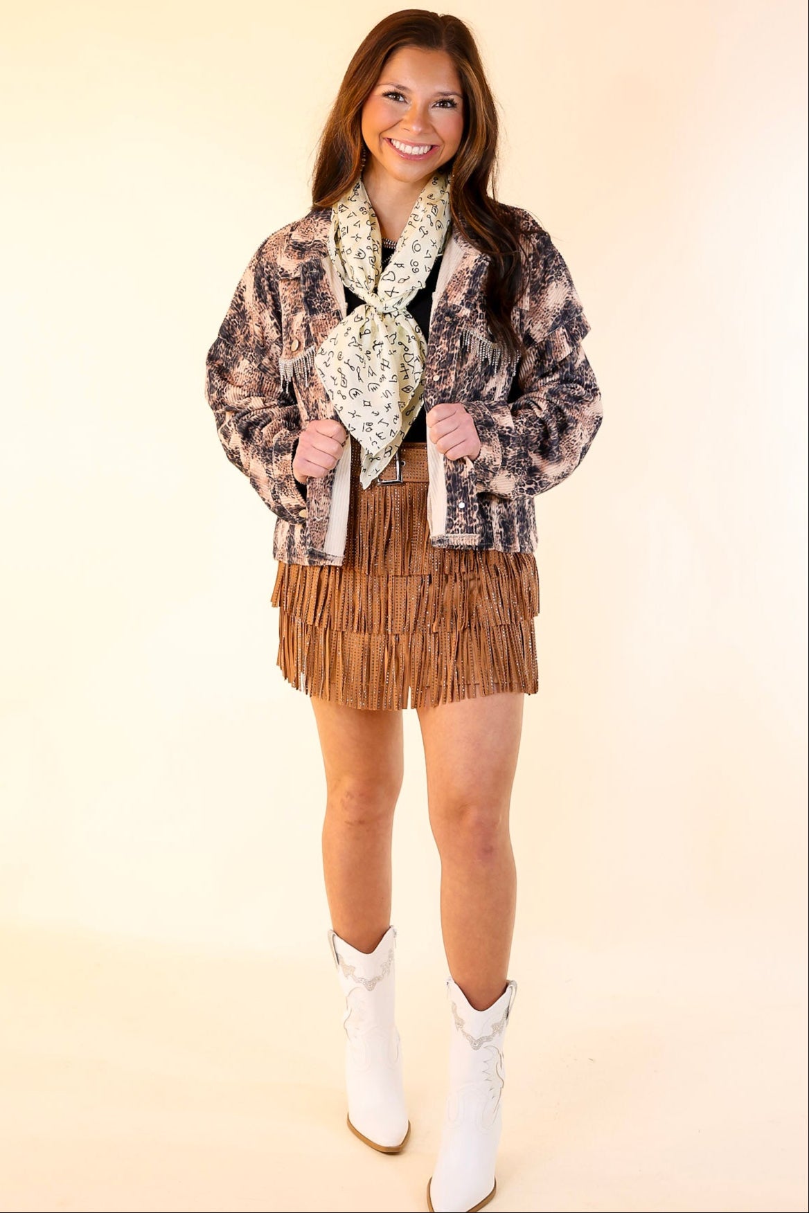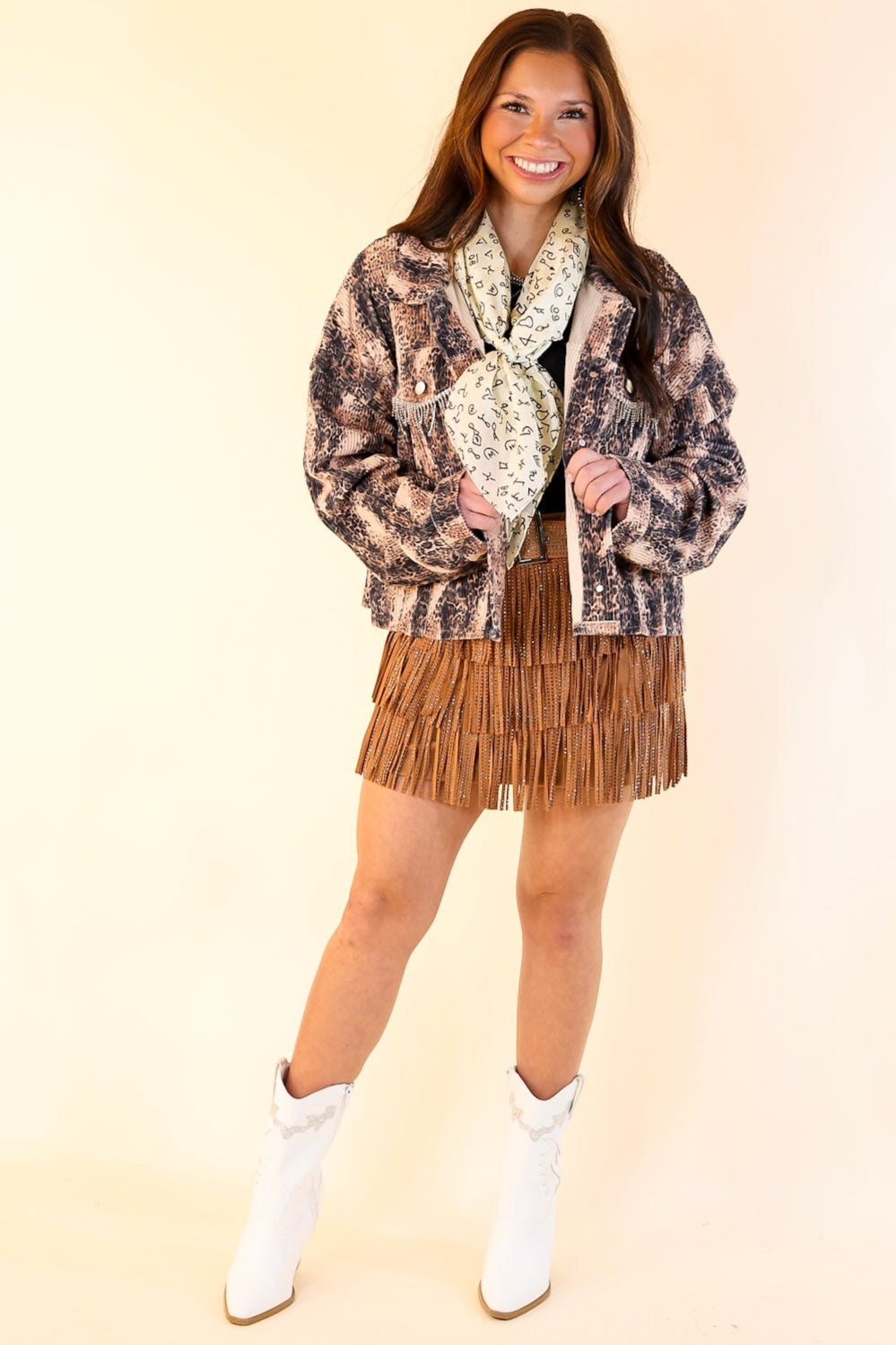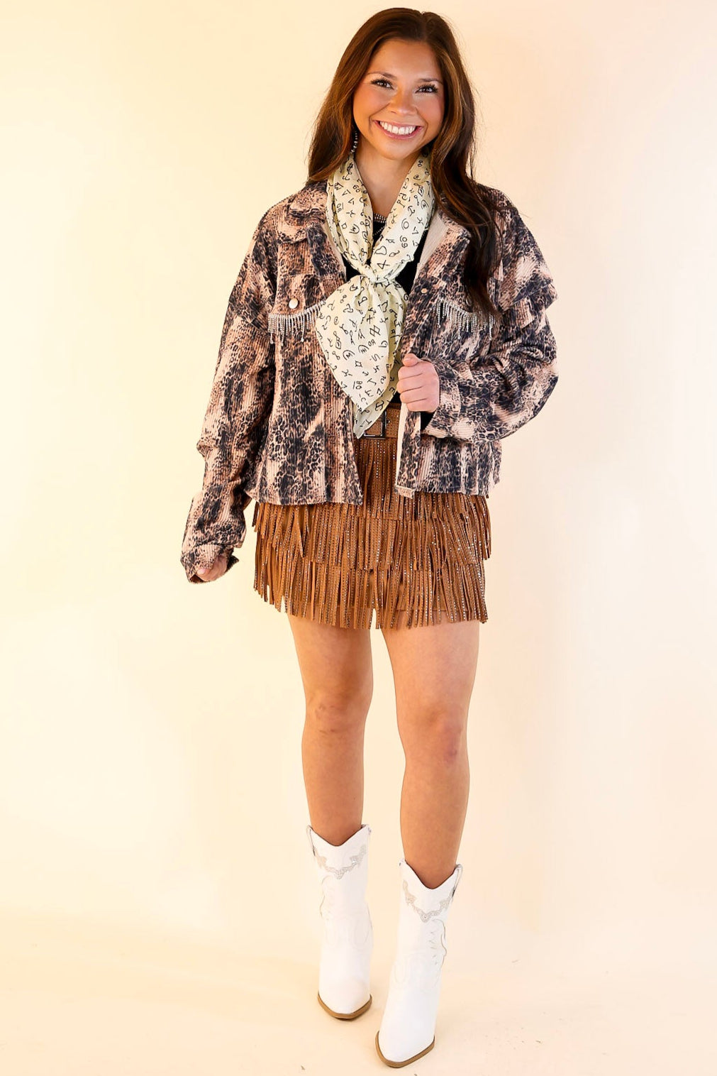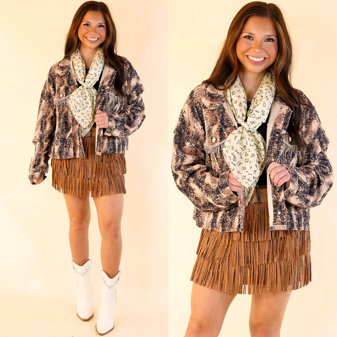 This new set is such a chic discovery! This jacket includes a corduroy body, a cute animal print, and a button up front with a collared neckline, and chest pockets with crystal fringe. Pair it with the matching skirt and fun booties and you'll be a show stopper!